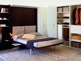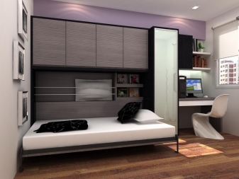 Transforming beds are becoming increasingly popular. Such furniture can significantly save the space of a small-sized apartment without compromising the functionality of the room and not use additional pieces of furniture.