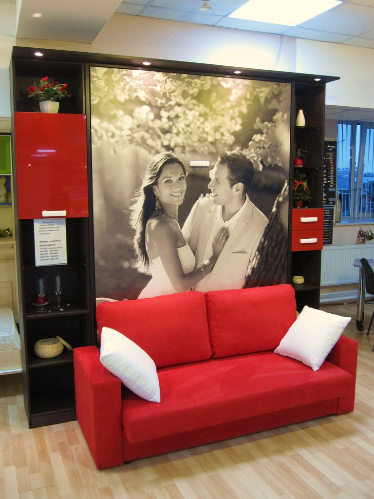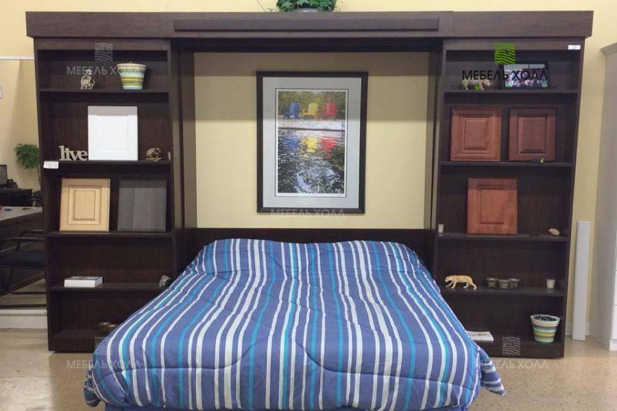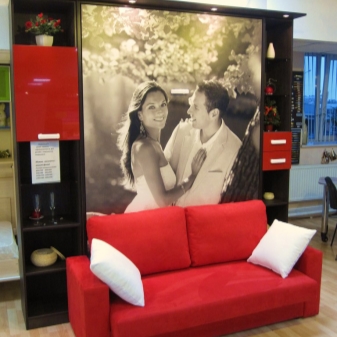 If there is a desire and opportunity, then the bed-transformer can be arranged in such a way that when folded it will completely merge with the surrounding situation and will be completely invisible. Designers use wallpapers, prints of various colors and qualities, which merge with the main part of the furniture that is present in the living room.