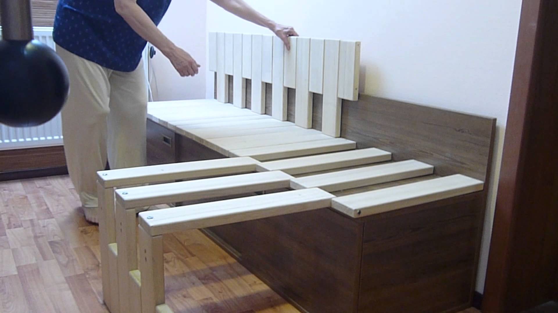 First of all, when choosing, you should always pay attention to the quality of the materials from which the transforming bed is made. If it is wrong to calculate the load, then, coupled with the "budget" types of materials, any model of this type can fail very quickly. In this case, you should not give preference to the usual Chipboard. It is better to opt for more durable models of MDF, and if you can, then purchase a product made of natural wood. Two thirds of the total load of such beds falls on its legs, so their optimum shape is the letter “G” or in the form of a wide board that is capable of bearing the support.
