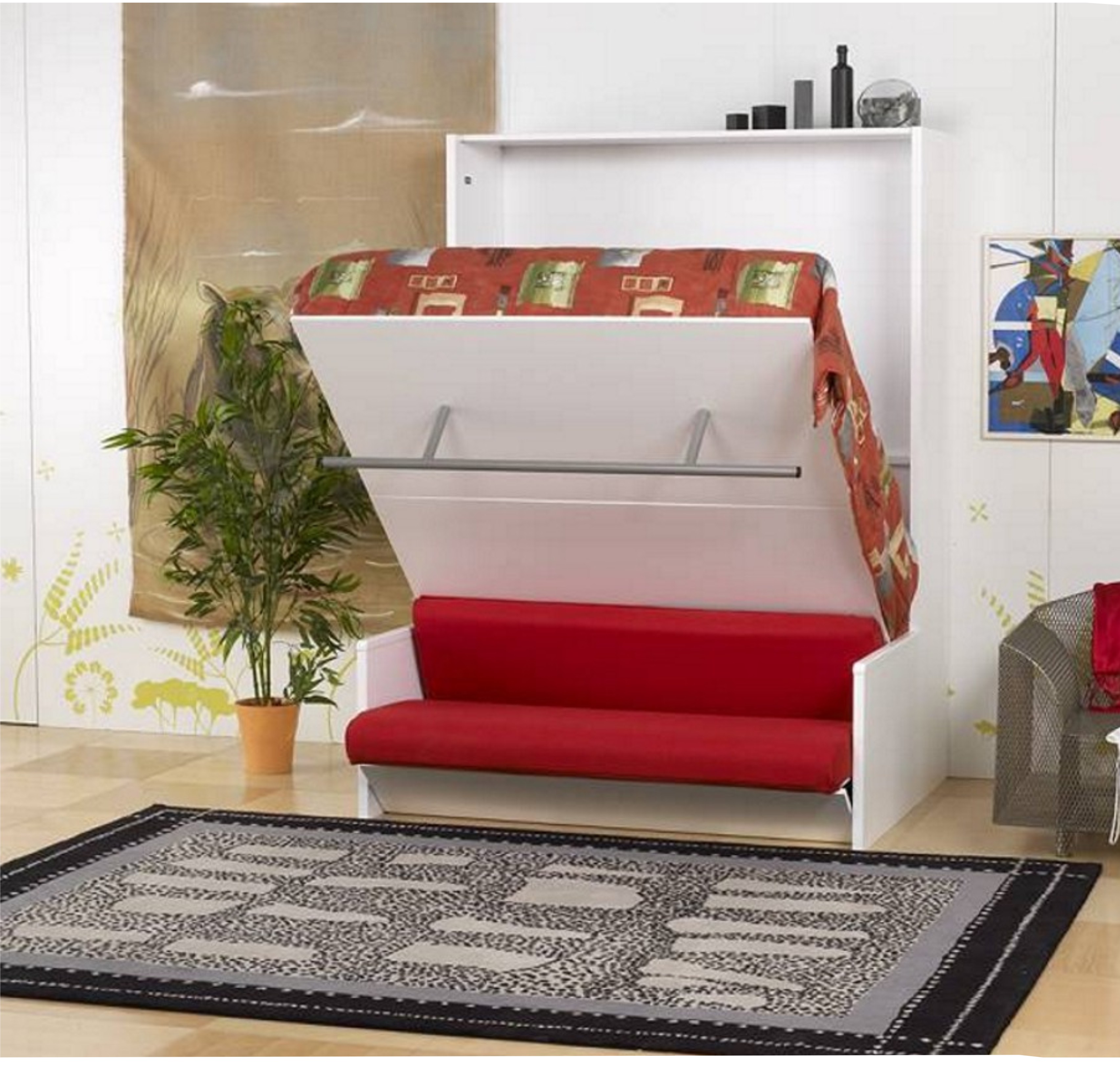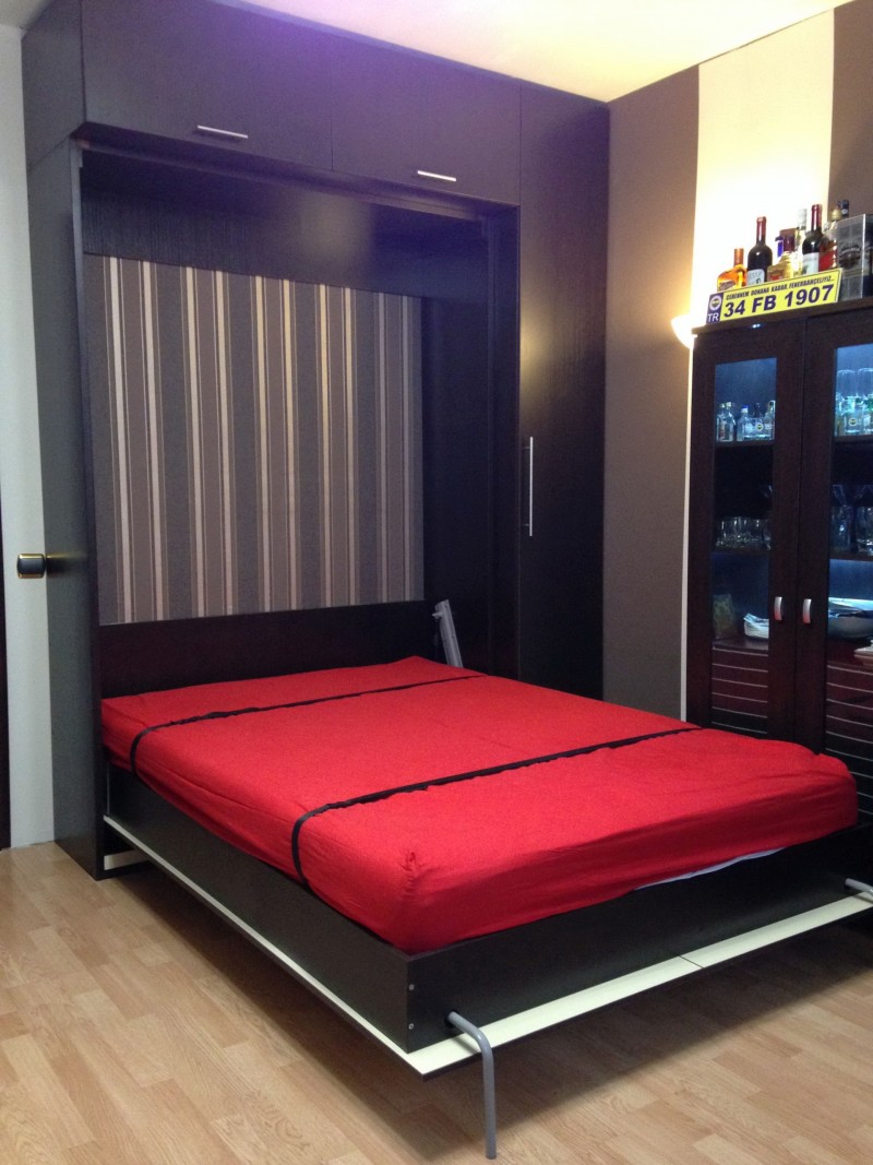 The transforming bed requires the most careful attitude towards oneself, mainly because of the regularly working lifting mechanism, which can break down due to its poor quality or because it was treated inaccurately. Therefore, it is important to consider all these points before acquiring such an unusual piece of furniture. The main advantage of such furniture is that it can be used everywhere: in the large bedroom, a classic wardrobe-bed can be decorated with a print or a mirror panel; it will fit neatly into the room, providing maximum free space.