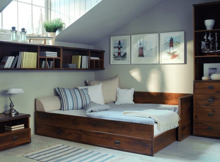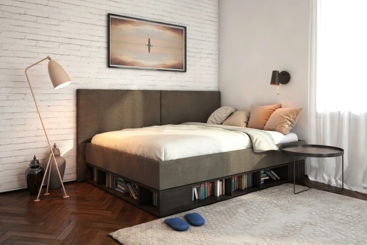 Despite the fact that such a built-in storage system is convenient and functional in itself, its essential drawback is the almost complete absence of bed ventilation. You can also find designs with a lifting mechanism.