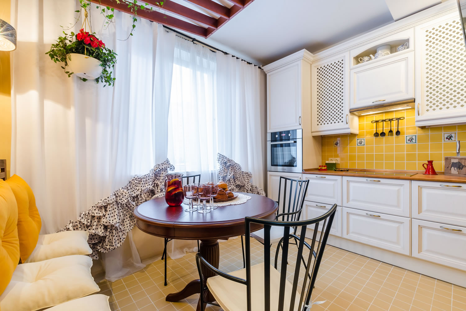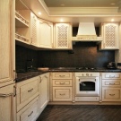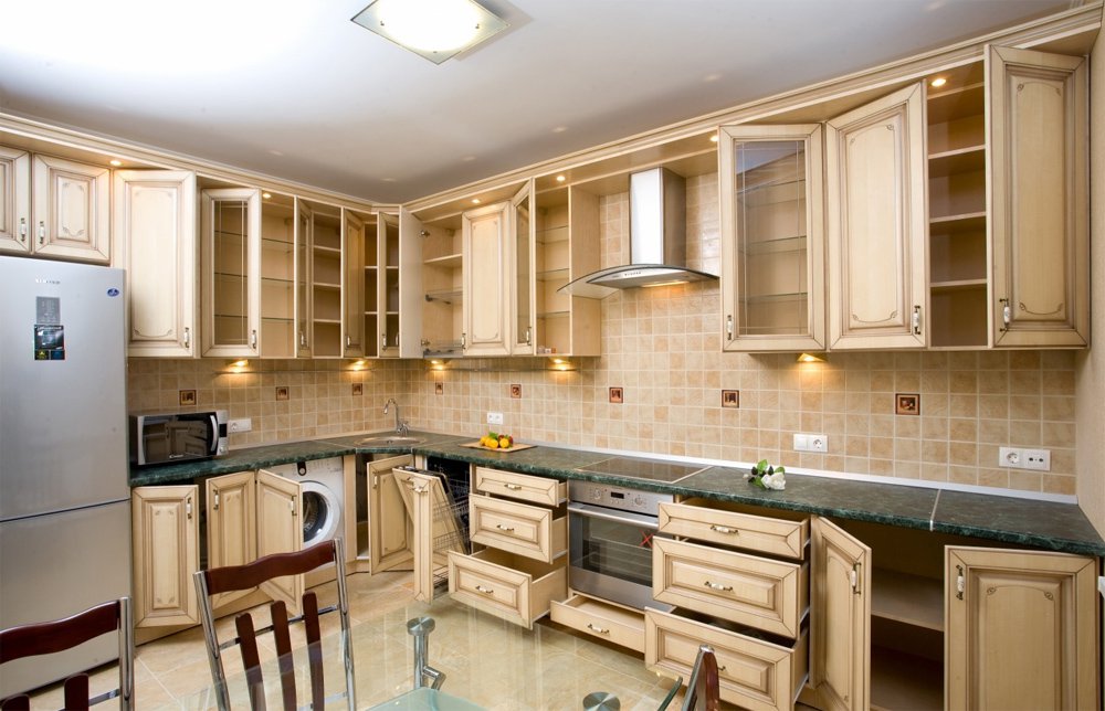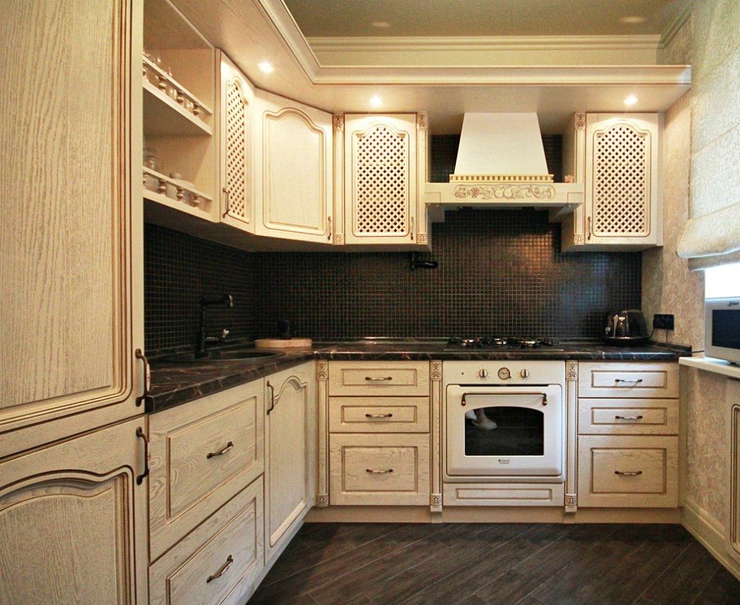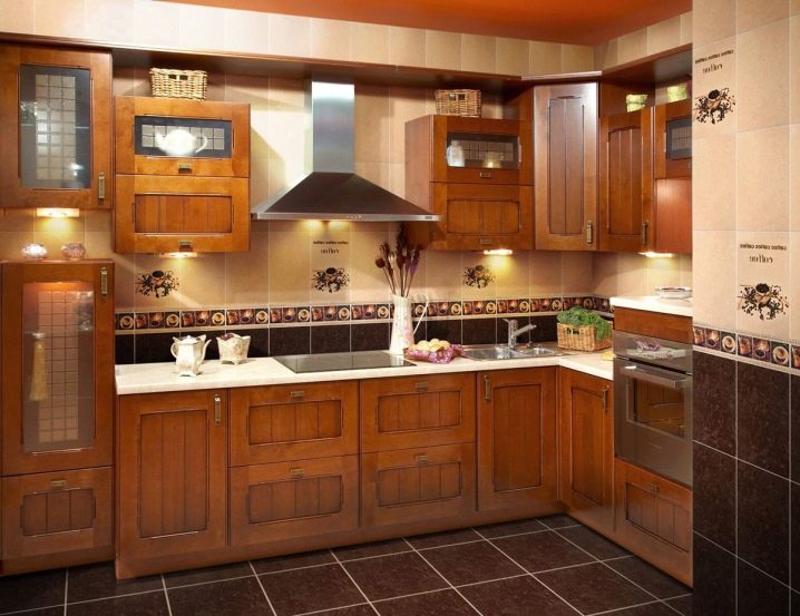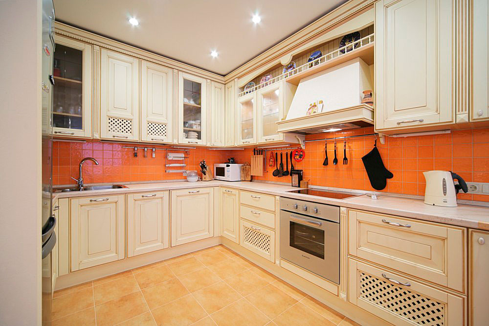 For classic cuisine is characterized by a monochromatic light tile, which can be decorated with antique ornaments.