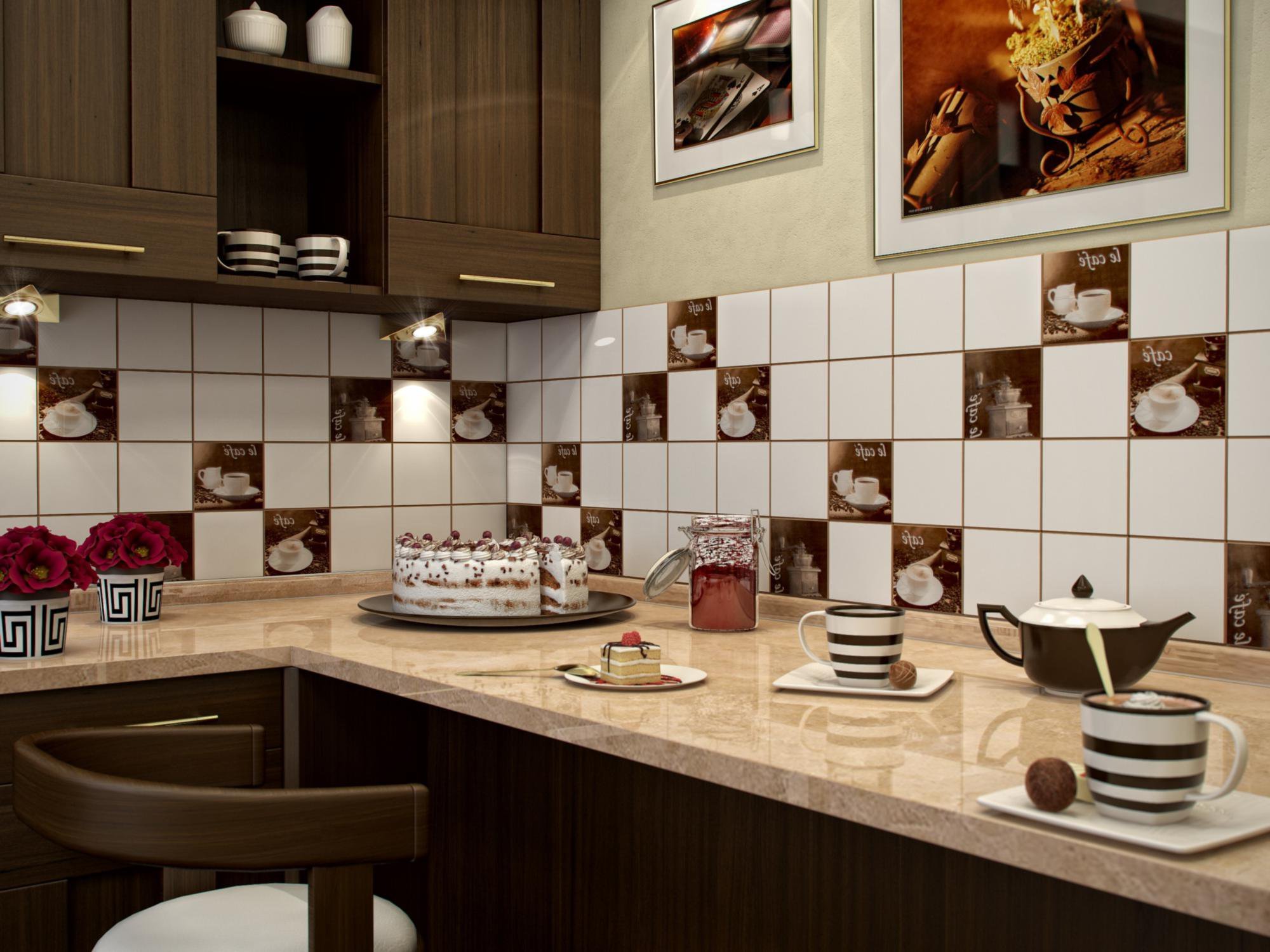 For a monochromatic brown or beige apron, ceramic inserts with the image of a cup, coffee beans or a pattern of intricate golden curls will suit. The peculiarity of beige is that it is able to shade and white kitchen set, and create a whole with the natural color of wooden cabinets, and soften a very bright and brilliant shade of glossy facades.