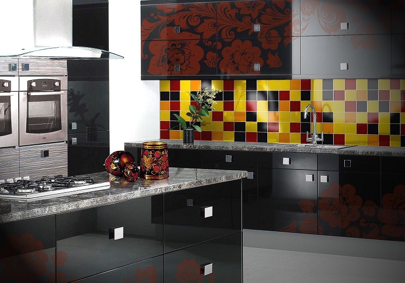The black tile is suitable for a classic combination with white. For example, black can be matte and patterned, and white - glossy, which will further emphasize the contrast. If you do not want a clear graphic, then white can be replaced with beige, which softens black. For an art deco style kitchen, bolder combinations such as black with red or yellow are suitable. Black color can be an excellent background for a tile that I would like to highlight, for example, aristocratic with gold or silver embossing, or lined pattern.