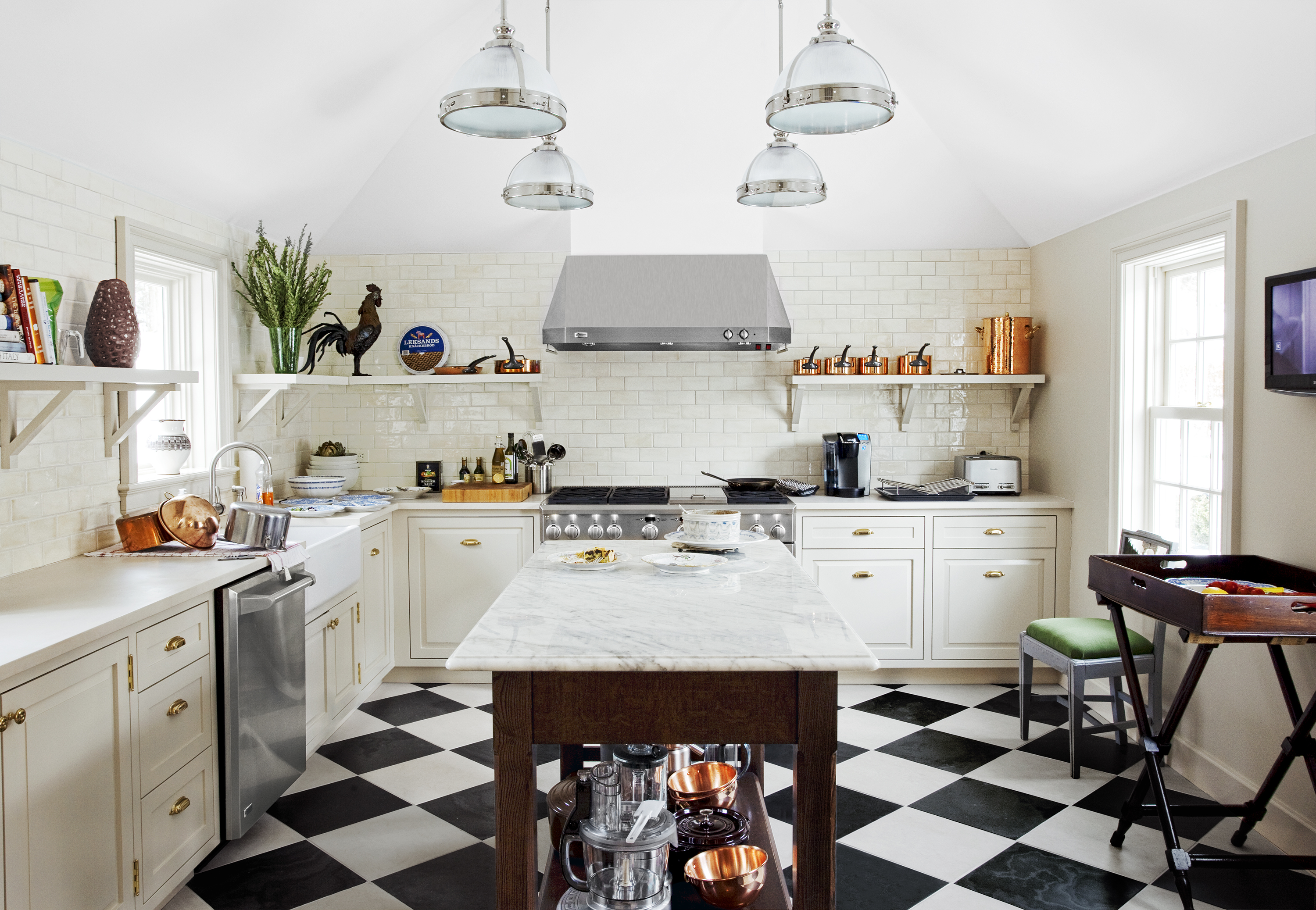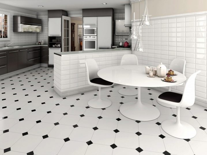 The combination of two types of tile in contrasting colors, laid out in a checkerboard pattern or graphic pattern, is ideal for the kitchen in a modern style.
