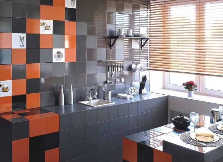 It is not recommended to completely decorate the kitchen in black. In this case, the room may appear smaller and, even with sufficient light, it will be too dark. The best option is to add one or more light shades of the tile. Depending on the overall color scheme in the interior, it can be beige, green, lilac or gray.