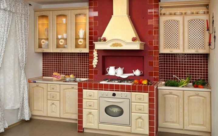 Maroon tiles in combination with olive-colored tiles and beige kitchen units are a good choice for country style kitchens. Monochromatic ceramics, for example, light gray, maroon, and brown, are more suitable for a classic interior.