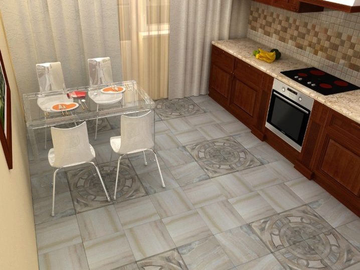 Along with practicality, the tile on the floor should be stylish, elegant and beautiful. Usually it is similar in color and texture to the apron, but stronger and larger in size. Or it can be a separate unit of the interior. In this case, on the tile there is some kind of pattern, floral ornament, or due to the game of different shades or colors the whole pattern is laid out. This option will fit in the kitchen in the style of Provence or Country.
