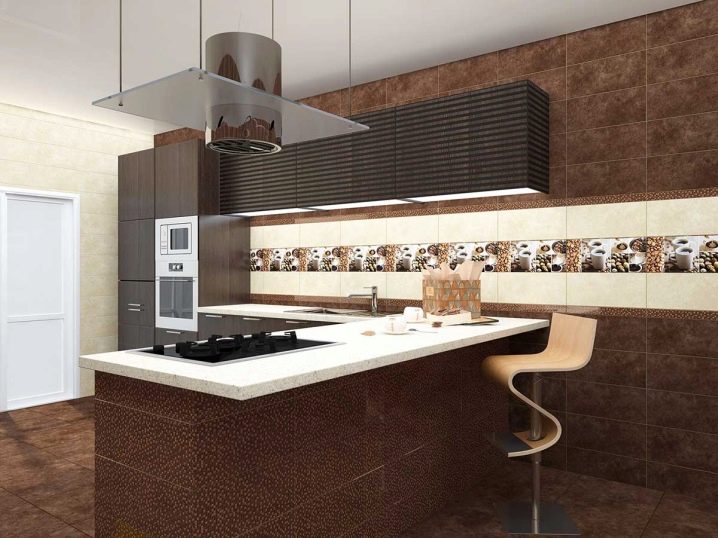 Brown tile in the kitchen looks very "tasty." Its shades are so diverse that there is an option even for the most demanding taste. Beige and coffee, dark brown and mocha, dairy and shade of wenge will create harmony in the kitchen and will fit almost any furniture. You can not care about the selection of suitable colors, it is enough to combine several light and dark shades of brown, and they will create a soft contrast.
