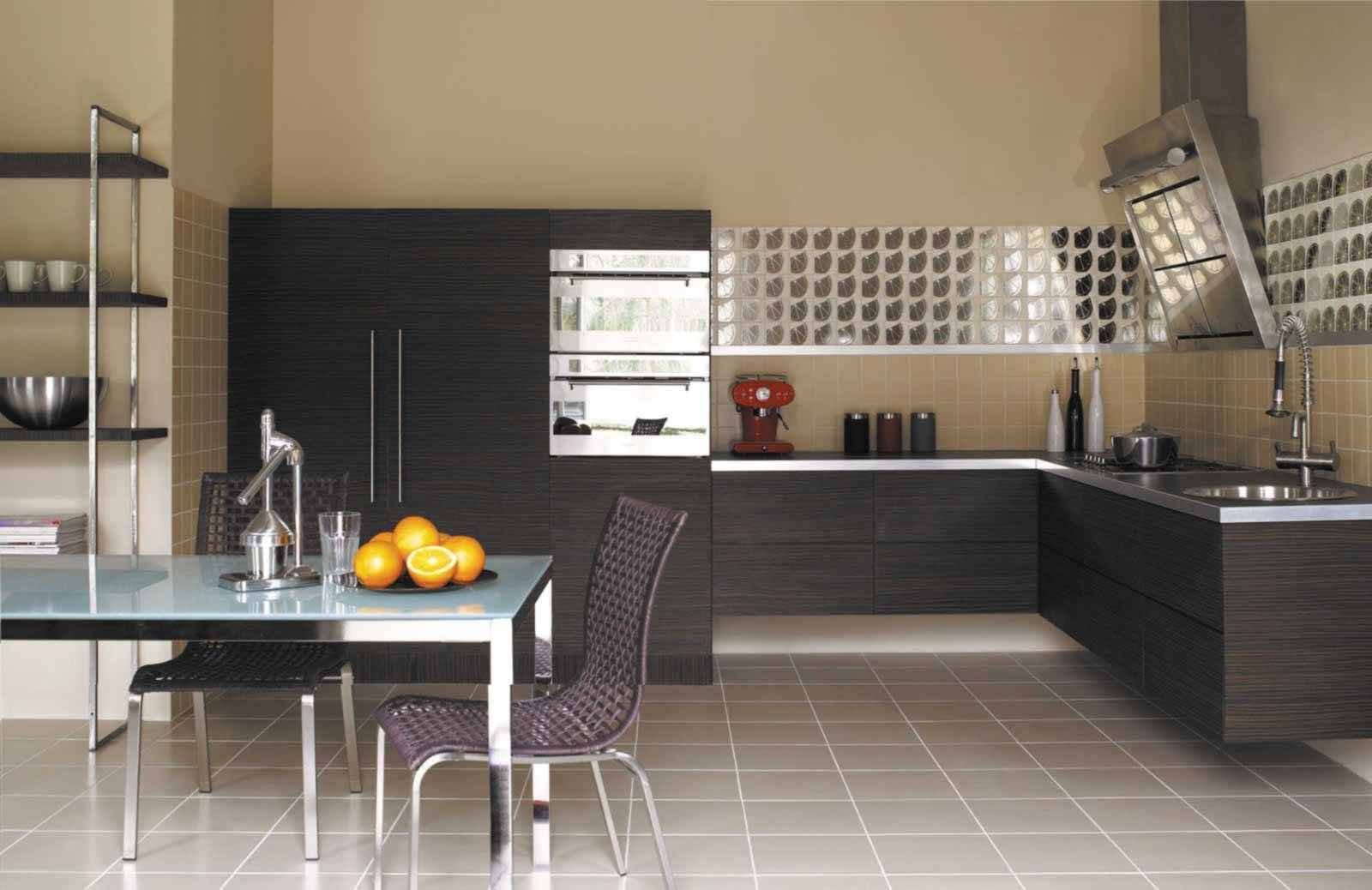 Since the kitchen floor gets dirty faster and more often than other surfaces, dark colors with a matte structure are traditionally selected for it. On the walls, you can lay out glossy tiles of light colors.