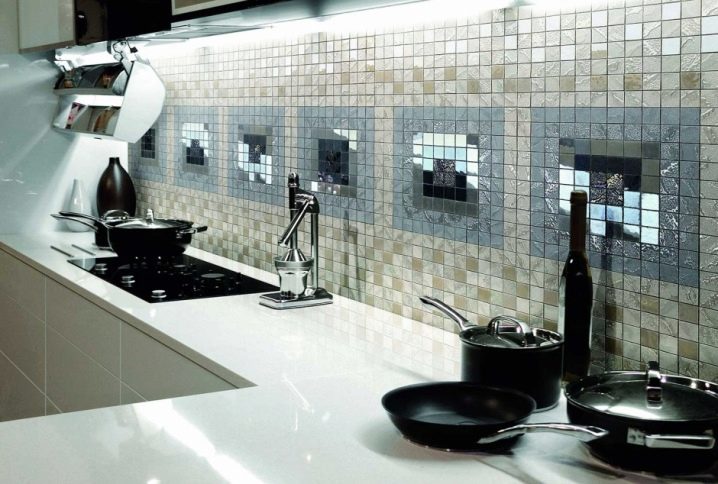 Mosaic. This type of tile is used exclusively for vertical surfaces. The mosaic on the worktop or kitchen apron looks very impressive. In addition to ceramic mosaic, there is also a glass tile and a mosaic of natural stone.