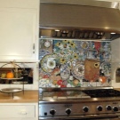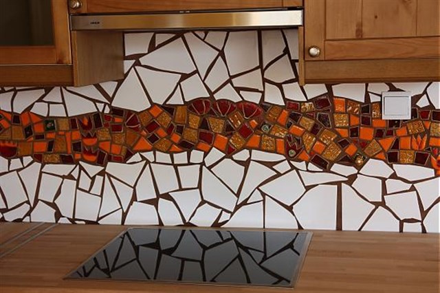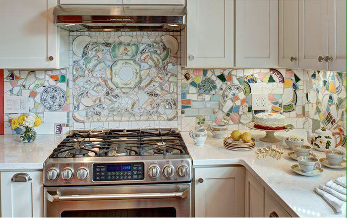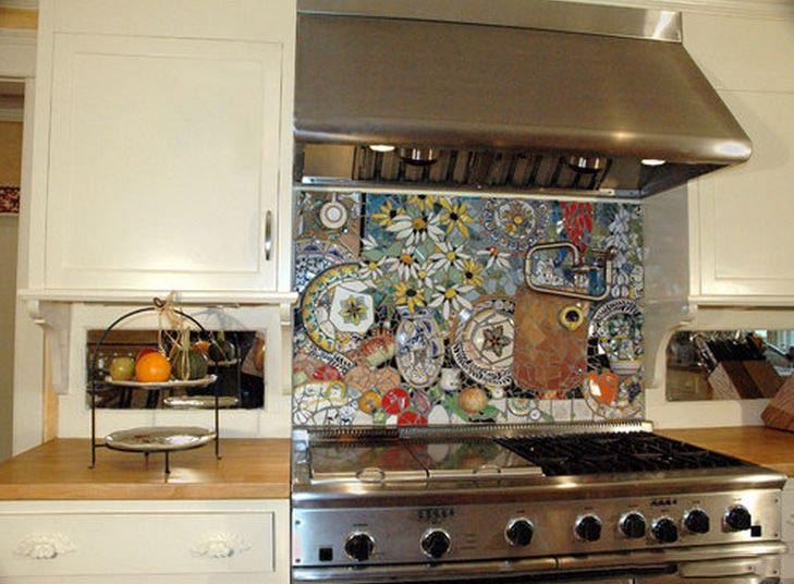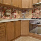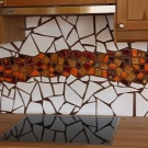 Kitchen panel, made from splinters. The technique is painstaking, the implementation is quite capricious, but very dramatic. Fragments resemble a broken mirror or a jug, and all together, put together, gives a feeling of luxury and comfort.