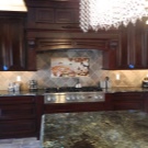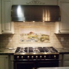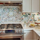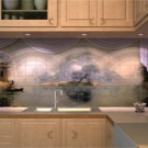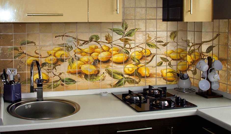 - Decol. In this case, specific ink is used to apply the image. After the drawing or design is ready, the tile is left in the oven at a temperature of up to 900 ° C. The result is a very durable, bright coating. Such a kitchen can be inherited, the colors do not fade and do not blur.