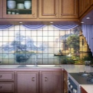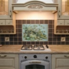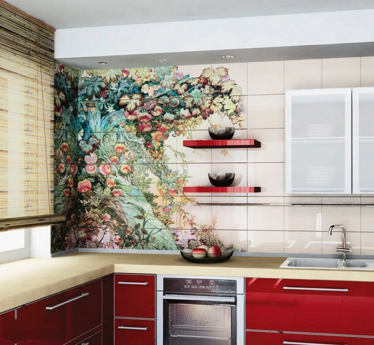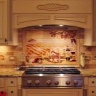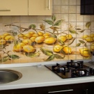 Classic option - panel with the image. The idea is simple. You have a certain composition, most often it becomes a central spot, and around it an auxiliary space is created (traditionally monotonous). This is very unusual from an aesthetic point of view. Thanks to modern application mechanisms, a real masterpiece will appear in your kitchen.