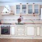 The decor of the kitchen in a fairly democratic modern style presupposes the presence of surfaces lined with smooth, smooth, glossy ceramic tiles of standard size or large floor, made "under stone, leather or wood." The kitchen in modern style allows for the presence of matte floor and mosaicwall tiles, and high-tech in the kitchen area prefers tiles “with a twist” - metal, “under silver”, gold or platinum, with holography, interspersed with crystals or “under brick”. On the floor of the kitchen in the style of Provence or Country are quite logical plates, imitating cobblestones, rubbed stone slabs or old marble, and on the walls and kitchen apron - a mosaic with natural motifs or hand-painted antique tiles. The Mediterranean style of the cuisine is shaped mainly by the colors and contrasts used in the ceramic tiles and the painted mosaic - bright blue, white or green-yellow, giving the atmosphere a sunny mood. Well, the strict black and white interior of the kitchen will refresh and revitalize the photo tile with bright original plots or the whole wall stylized as an old stonework.