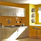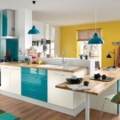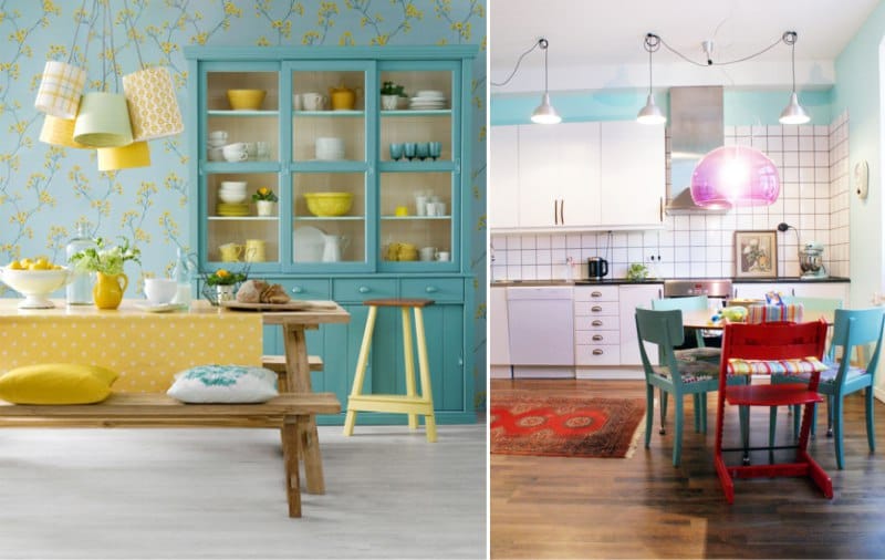 Cheer up yellow walls and furniture in azure, Tiffany, coral. This combination has a beneficial effect on the psyche. You just need to choose a quality paint and finish for the apron, flooring and curtains in the kitchen. The facades may differ by a couple of shades from the dining table or corner sofa. This combination will allow you to feel the rise and surge of vitality every time you go into the kitchen.