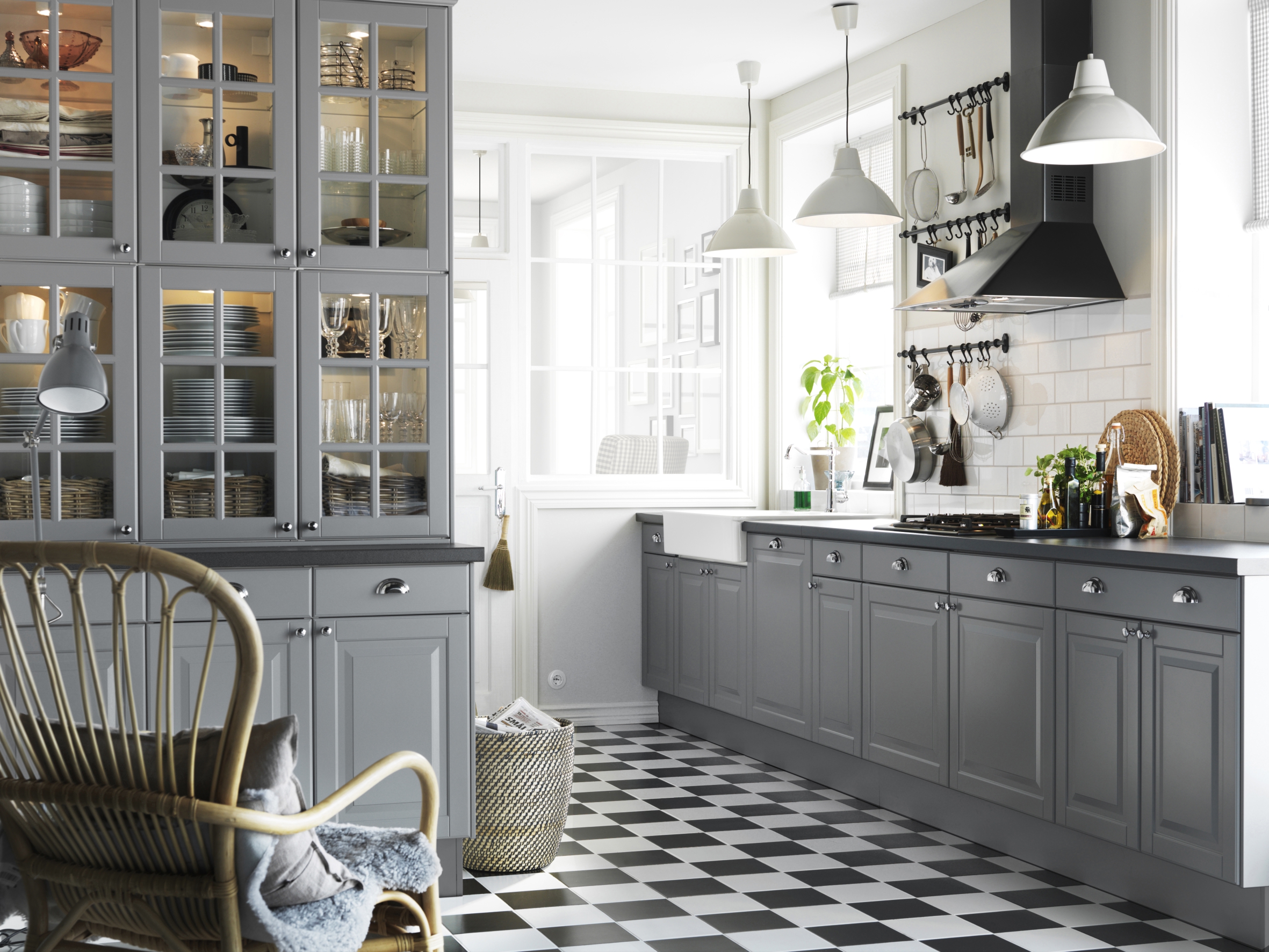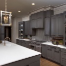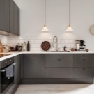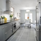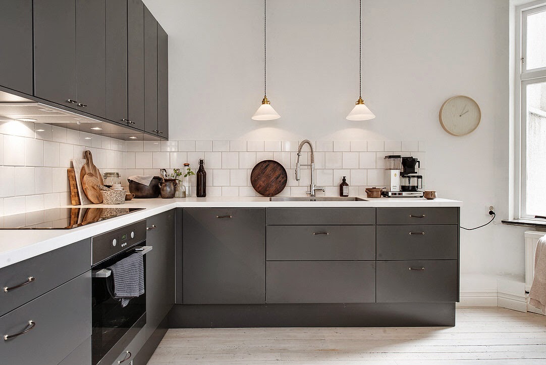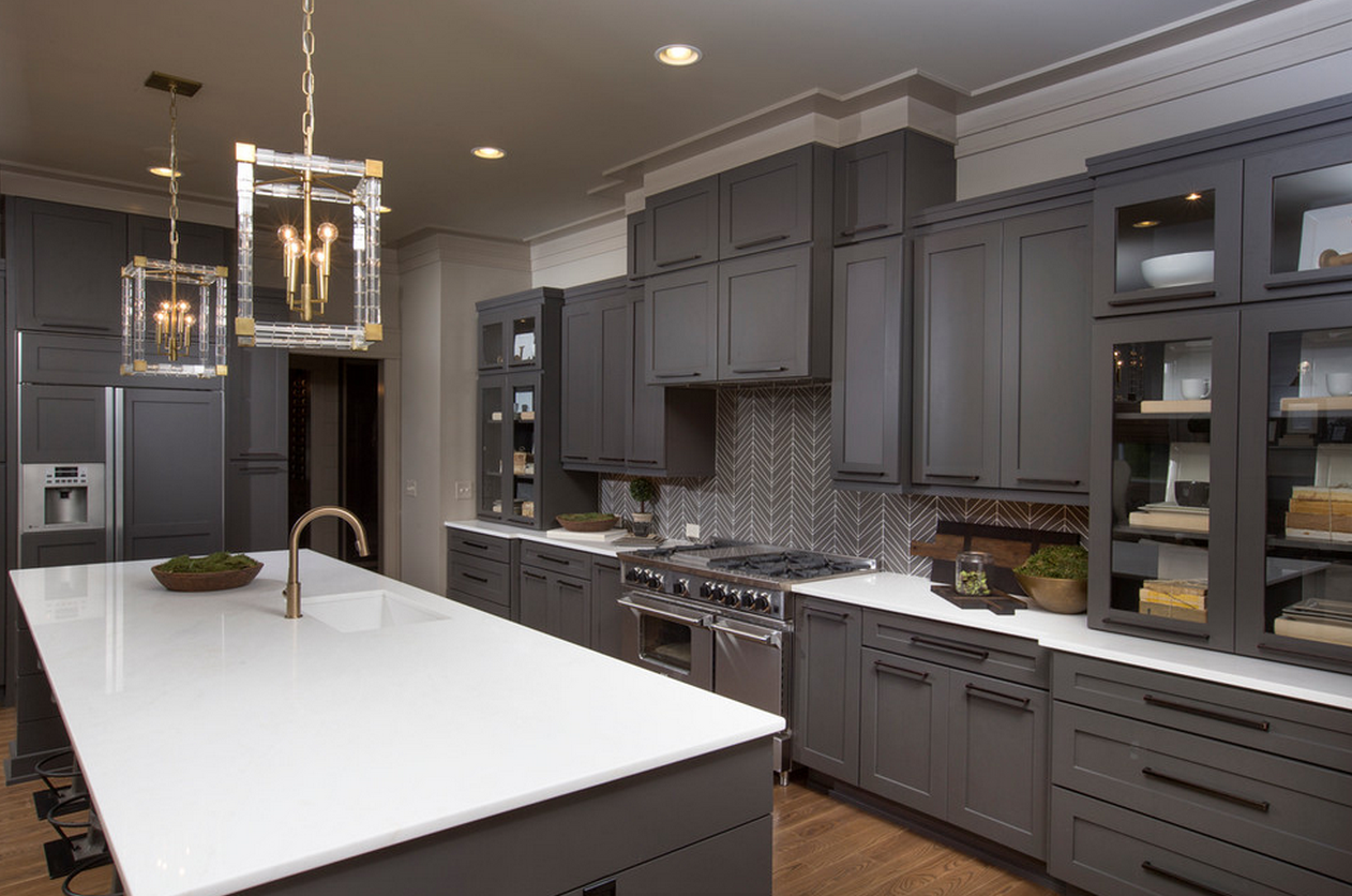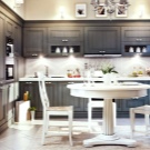 Gray kitchen looks perfect on the background white, powder-pink, turquoise walls. Facades may not be monolithic, decorated with silver, mirror or translucent frosted inserts. The same elements can have a wall. Graphite, pebble color stands out from any pastel or total white fashionable today.