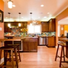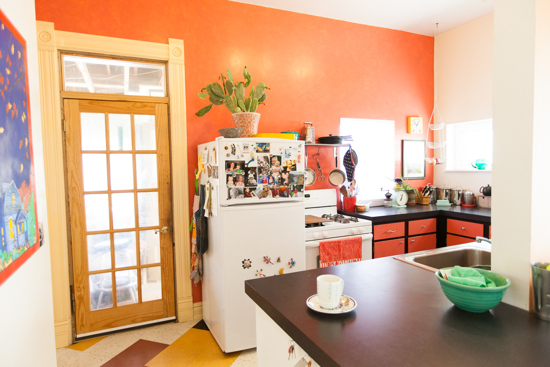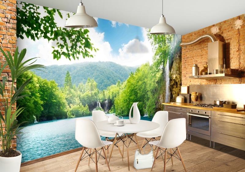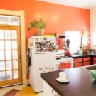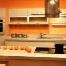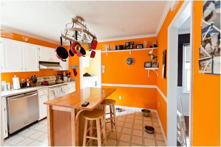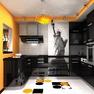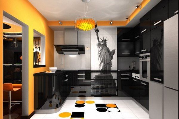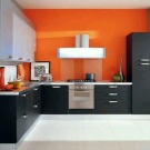 Stylish orange walls will present the interior with passion, energy, splendor. On their background, not only a black, green, white set looks great, but also any kitchen utensils. You can easily hang a unique panel above the hob, enjoy the exquisite transition to the Ombre technique from light orange to fiery red Flame. Any textiles (snow-white napkins, towels), as well as mosaic, glass apron, mirror surfaces will reflect the style and luxury of this palette, inspiring the hostess to new culinary masterpieces.
