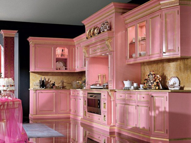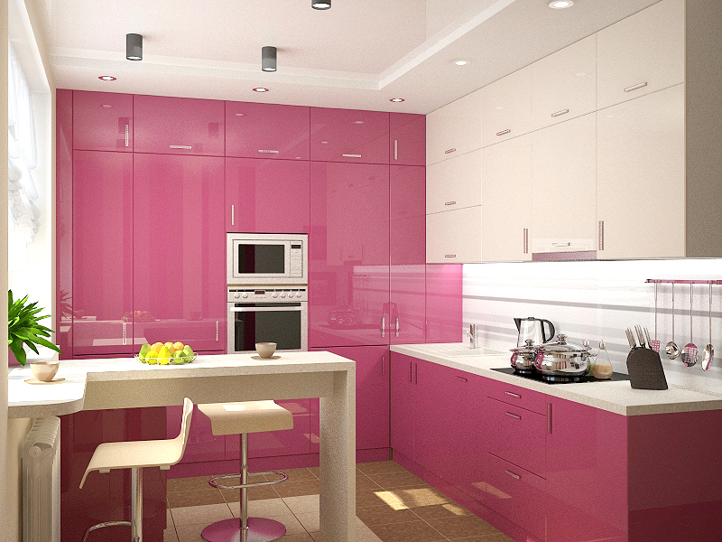 In the apartment where the lonely girl lives, by the way will be pink walls and facades of kitchen set. Rebellious nature can use expressive Pink Yarrow, fuchsia, as a key tone. Cases, shelves and racks then need to be done in soft pastels with small patterns of flowers, ethno ornaments.