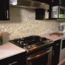 The option of finishing the kitchen with decorative stone is rather expensive, but very beautiful and luxurious. You can lay out the kitchen wall with natural solid-size stone, and you can decorate the kitchen with fragments of such stones. A skillful master or designer can collect interesting and unusual drawings and even whole works of art from fragments of pebbles.