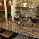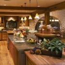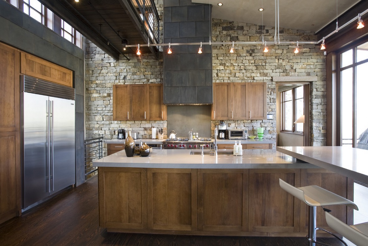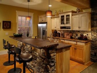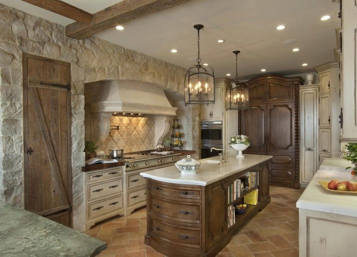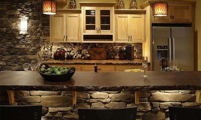 It is best to provide a subdued light for the kitchen with a stone finish, because the stone does not respond well to bright sunlight. The subdued light in combination with stone trim will make your kitchen luxurious, cozy and mysterious. The stone is perfectly combined with the color of greenery, so you can safely put in the kitchen with stone trim many beautiful plants in carved pots. The combination of stone and greenery is natural and, therefore, it is especially beautiful. Perfect for large stone kitchens and wicker plants, they are best placed along the walls, closer to the window.