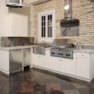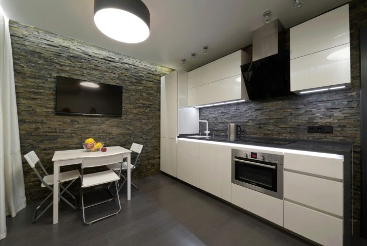 Now on sale there is a huge number of models of decorative stone for finishing the kitchen. It is small or large, dark or light in color, embossed or smooth texture. You can choose a flat or three-dimensional natural stone, depending on what you plan to trim with such a decorative stone.If such a material will be finished floor, it is better to give preference to smooth models. If you are going to decorate the walls with decorative stone, you can choose more interesting three-dimensional models.