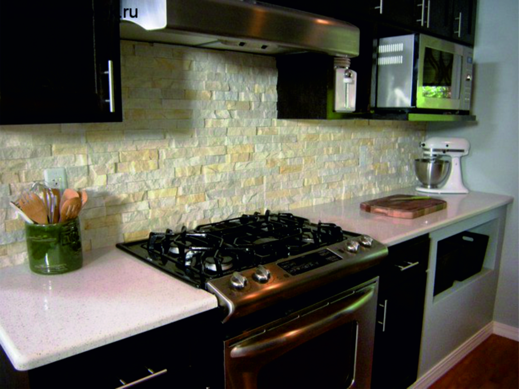 By its strength and reliability, artificial stone is almost as good as its natural counterpart. At the same time, it looks no less elegant than the natural one. Artificial stone also looks great on the wall of the kitchen, you can choose just such a material that is suitable in color and design for your kitchen.