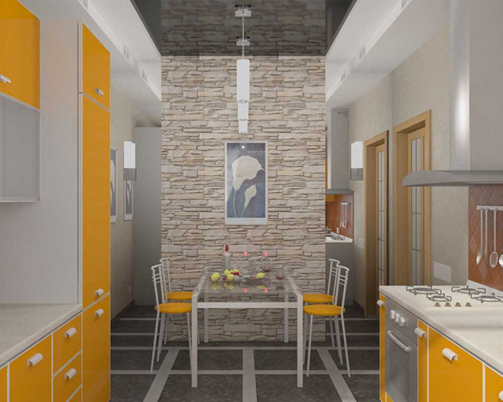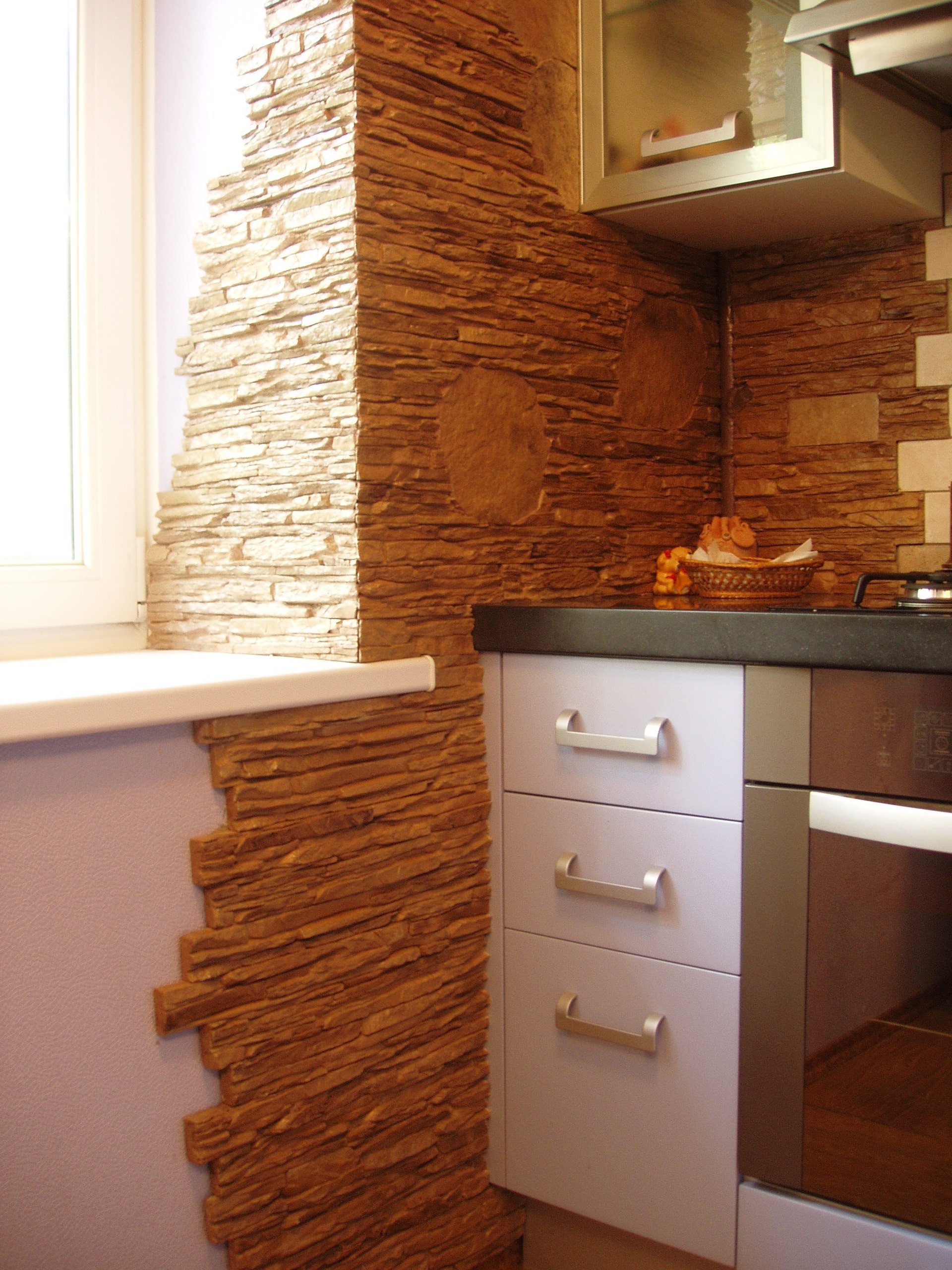 Particularly noteworthy are the external characteristics of the ornamental stone: it enchants with its relief texture and the beauty of its modulations. Another positive feature of this finishing material is the ease of installation. Laying the floor or wall with a decorative stone can be your own. Thus, you can even create original and unique design and make your kitchen unique. In addition, the stone is universal for mounting on any surface, it is able to hide all the shortcomings of the walls and the floor, as well as a stone, you can close the damaged corners and protrusions.