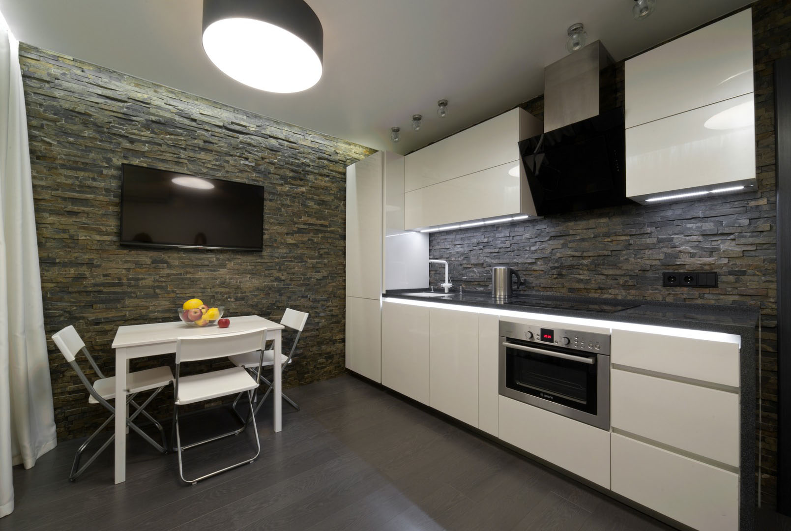 Now decorating the walls with decorative stone is at the peak of popularity. This is due to its rich appearance and a large number of its other advantages. The first and one of the main features of the stone is that it is completely eco-friendly. This is a very important quality that any building material for the kitchen should have, since cooking takes place there, and this process should be as hygienic as possible. The second clear advantage of the stone is that it is very durable. It is perfect for those who do not plan for a long time to make repairs in the kitchen.