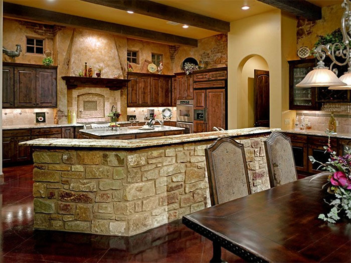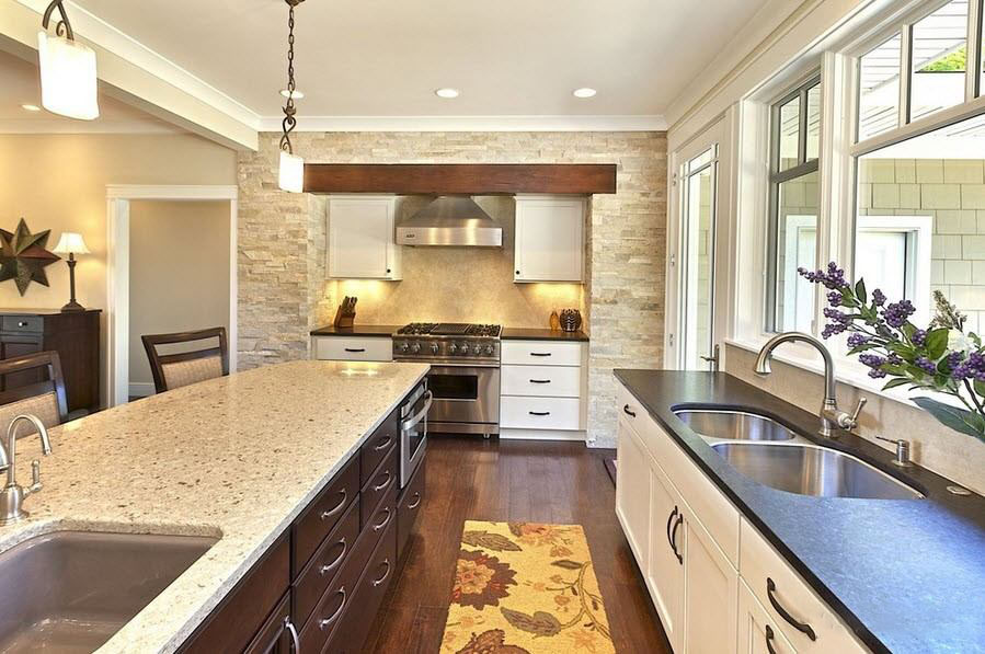 Any hostess dreams that her kitchen was beautiful and cozy. You can create an interesting kitchen design by decorating its walls, floor or doorways with a decorative stone. Natural stone is one of the first in terms of reliability of materials suitable for kitchen decoration. Such a stone will serve you for many years. It is important that the stone is heat-resistant and very durable, it perfectly tolerates mechanical and chemical effects, and also it is not afraid of temperature drops and high humidity in the room that it adorns.