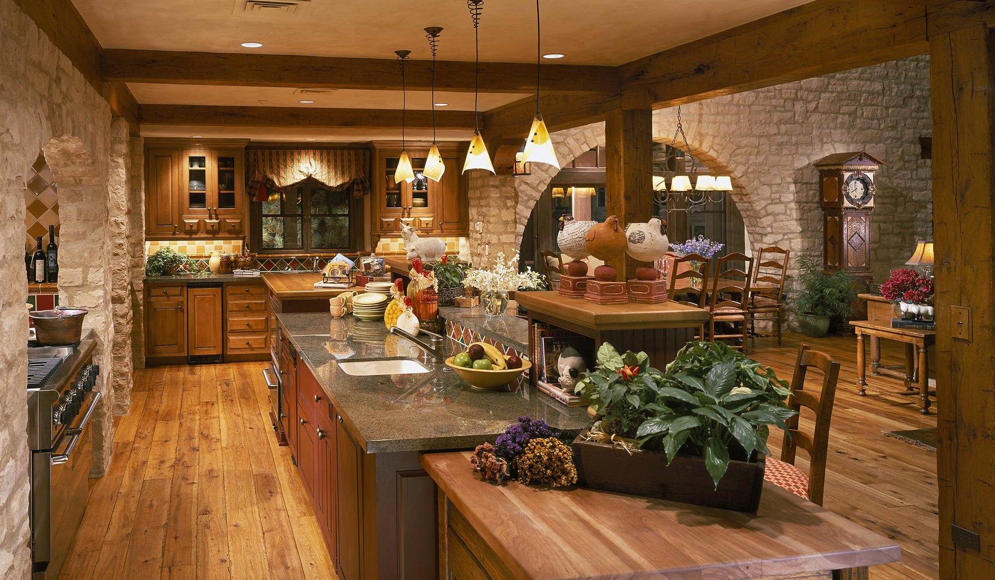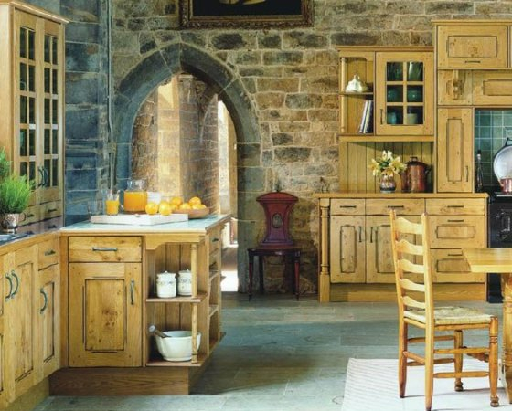 In order to create a kitchen with an interior in the style of "country", it is necessary to create a harmonious ensemble of stone and wood. Stone floors or walls look great in combination with wooden furniture. You can purchase a kitchen set with a wooden finish in such a kitchen, and put a rocking chair in the recreation area. The tree will bring the warmth of nature into your kitchen, and the stone decoration, on the contrary, will cool it. This is a very harmonious combination, these two elements perfectly complement each other.