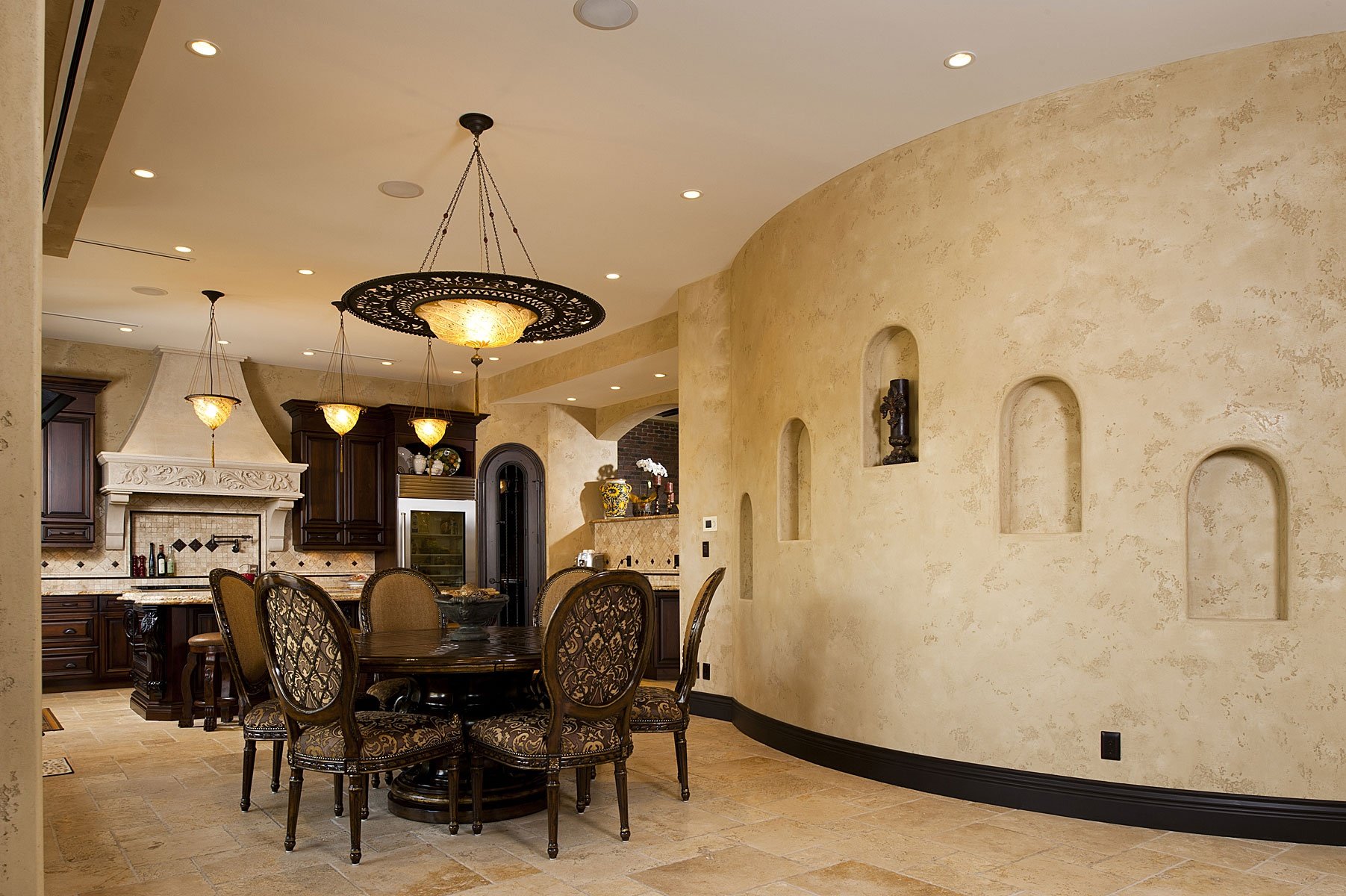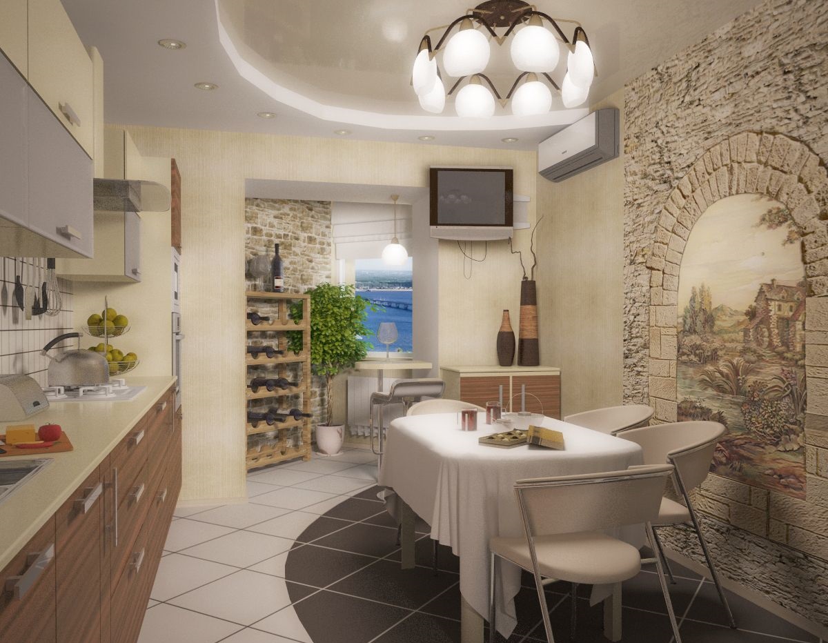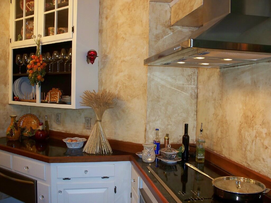 In the kitchen you can also try to paint the walls with decorative plaster.It allows you to create an imitation of a dense stone structure.