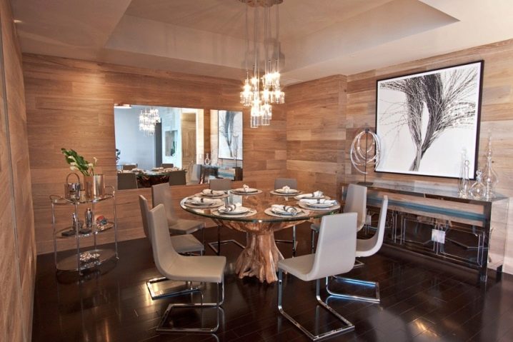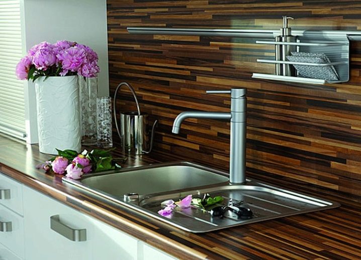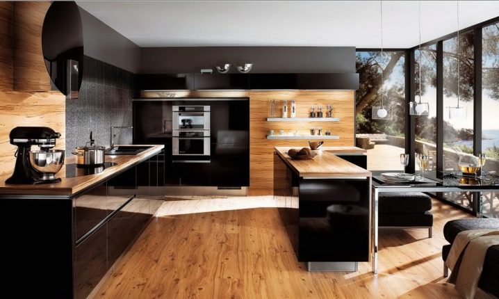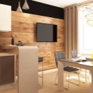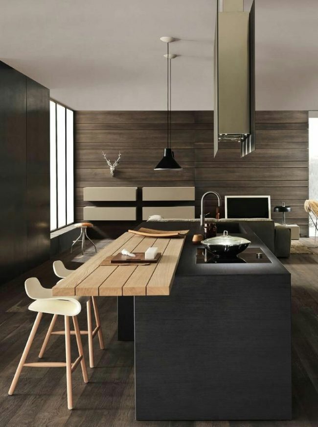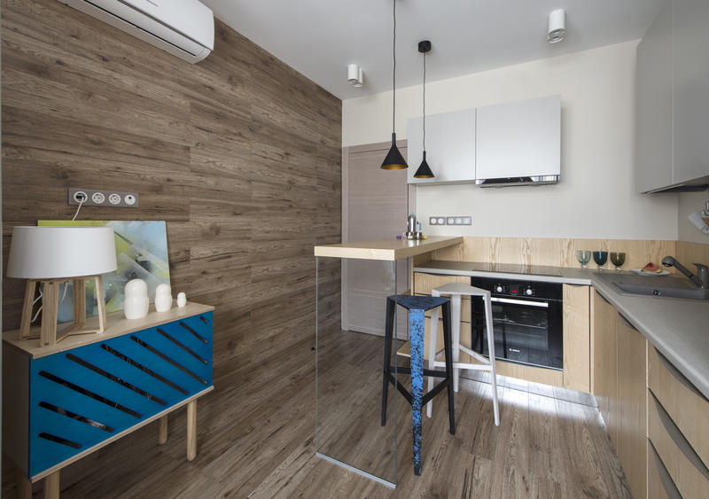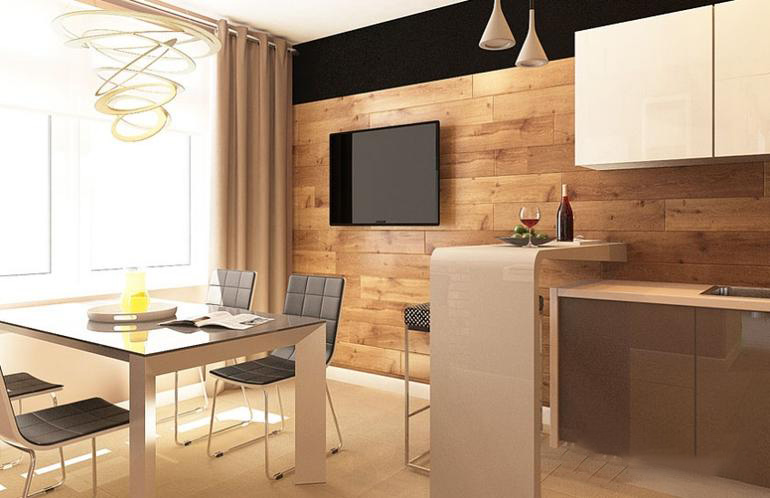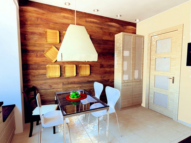 Laminate on the wall looks quite unusual, especially if this wall is in the kitchen. In the cooking zone, wooden lining mostly plays a protective role, and then it acts as a decor. Also, using wood panels of contrasting shades, one can delimit the space of a small kitchen by separating the cooking zone from the place of eating.