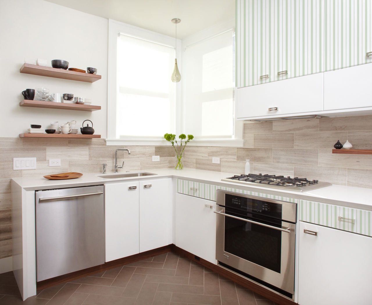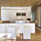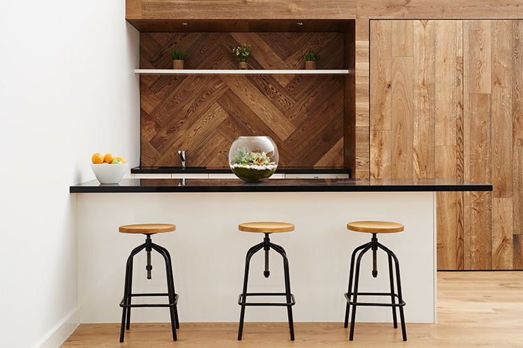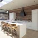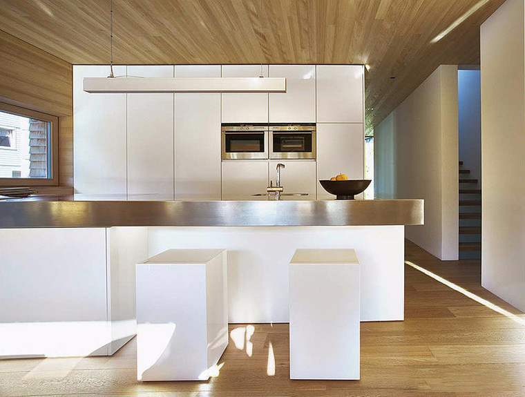 Very stylish solution in a modern kitchen in the style of minimalism. In this photo, an apron over the working area is laid out very unusually - in the form of a “Christmas tree”. This solution looks rather unusual, which allows the apron to stand out against the general background of adjacent surfaces covered with identical wooden panels laid in the traditional way.