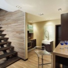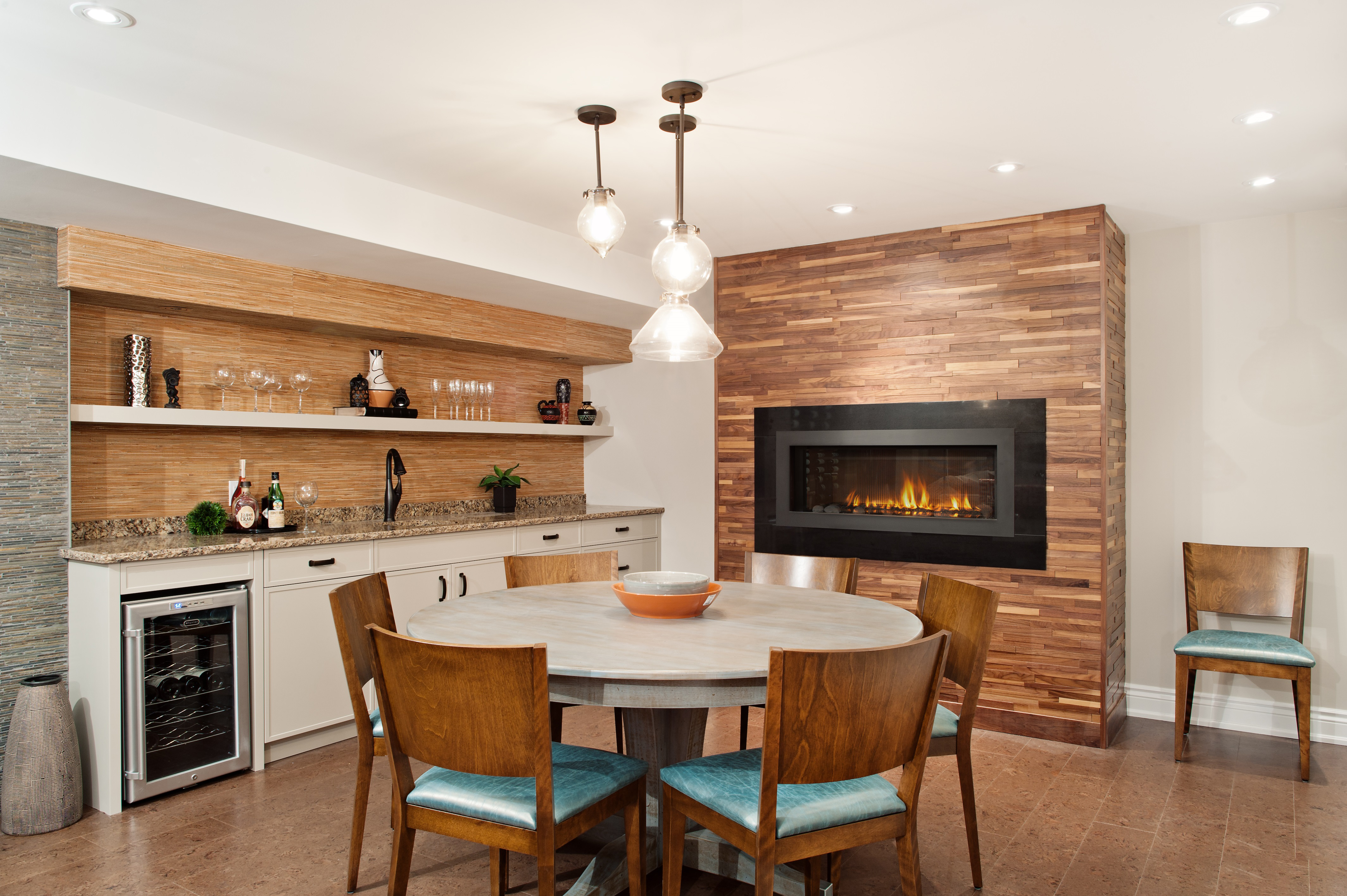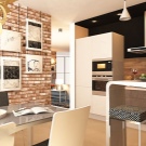 Modern kitchen with fireplace and one-level suite. In this example, the laminate acts as a covering for the whole wall in which a fireplace is installed and is a practical and stylish alternative to a ceramic apron over the sink.Shades of wooden decor are perfectly combined with the flooring and wooden chairs.