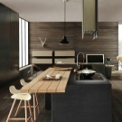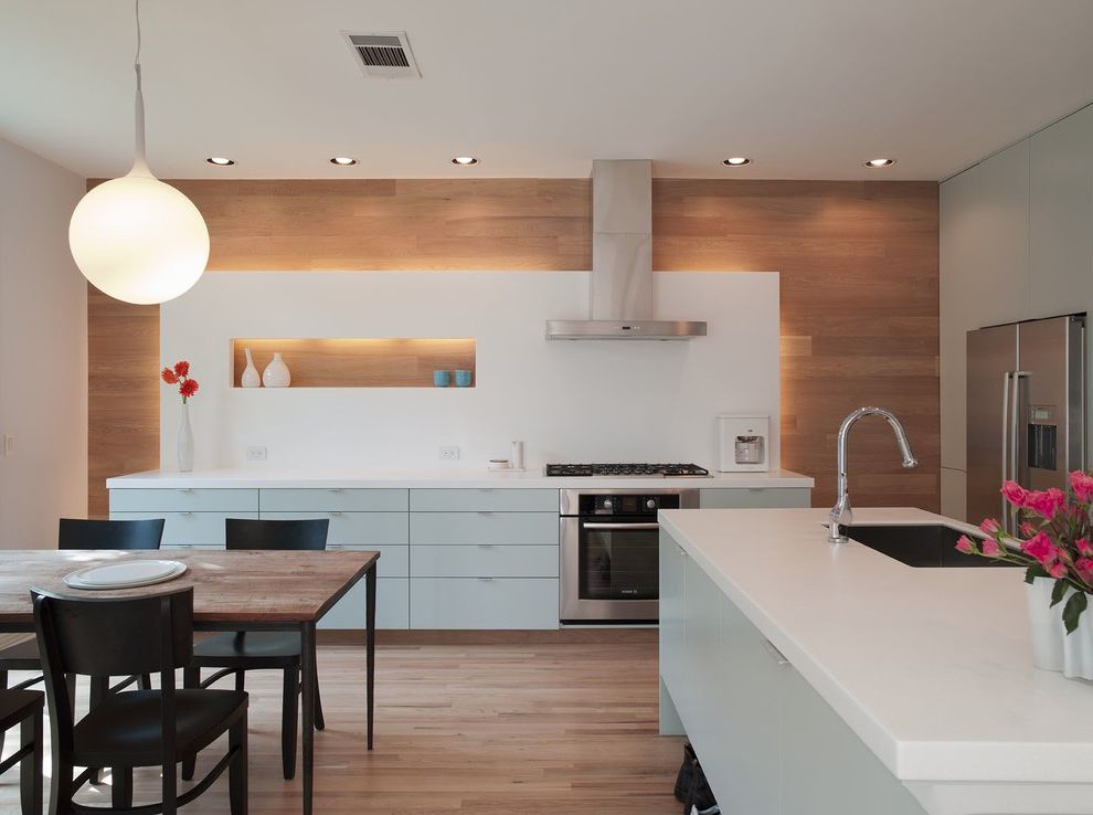 Stylish kitchen in minimalism style.The colors of the modern interior are the most common - black, gray and white. Some highlight to the design is made by geometrically regular wood panels located in the apron area and on the adjacent wall. This example proves how natural and modern tech colors can harmonize without harming each other.