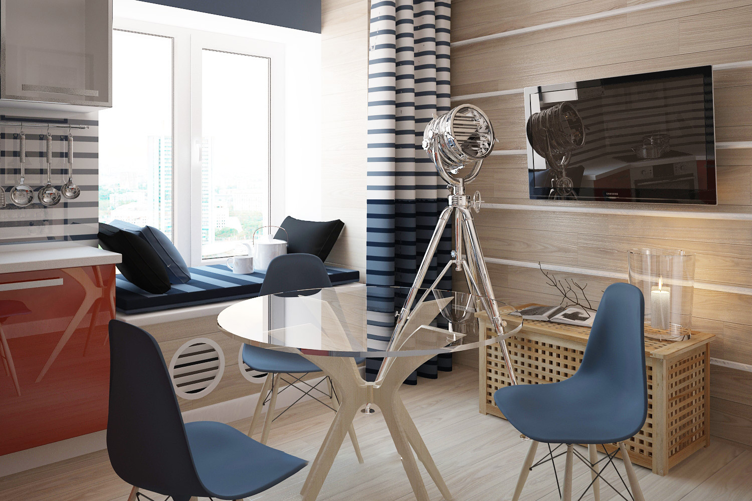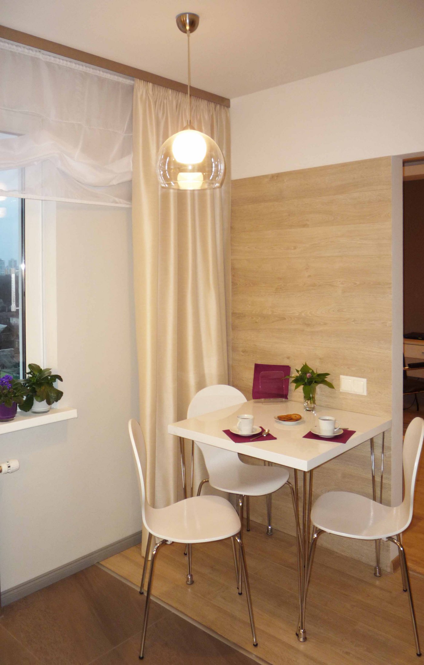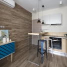 Pretty practical and bold option. Absolutely all surfaces (walls and ceiling) are covered with the same type of laminate. It would seem that the space should “merge”, but this did not happen due to well-chosen kitchen furniture.