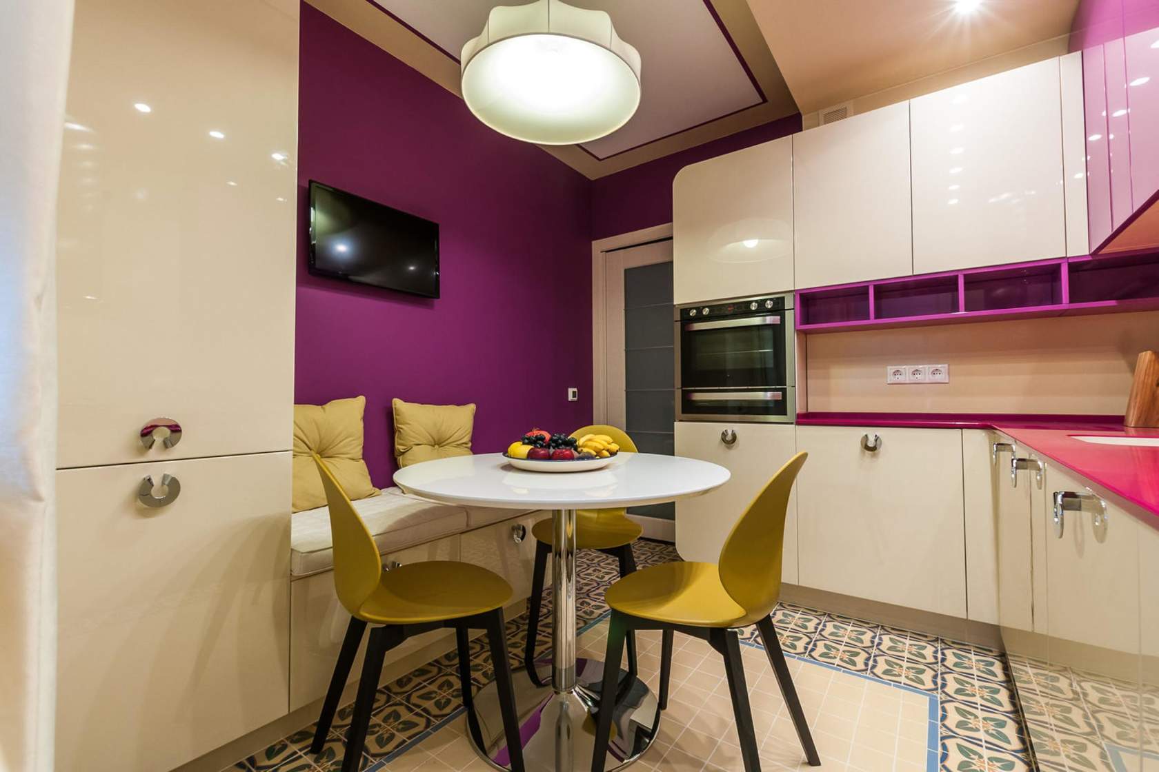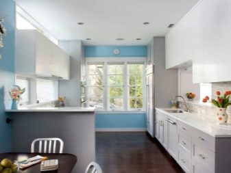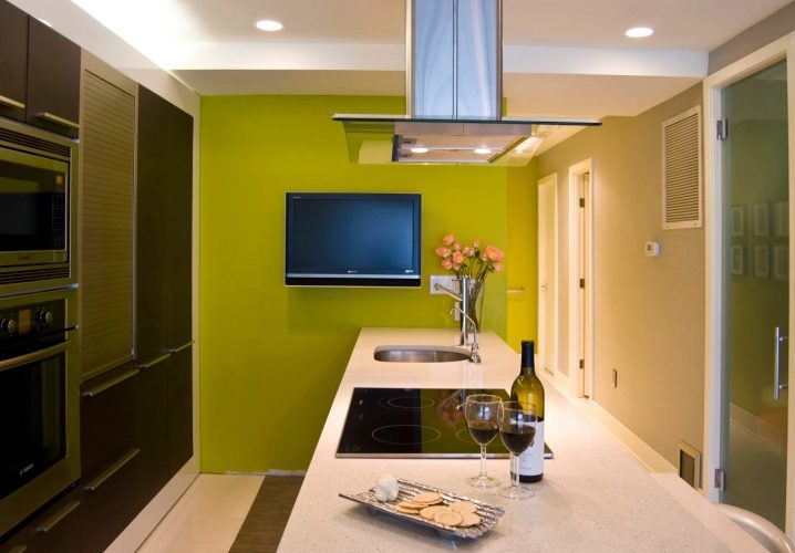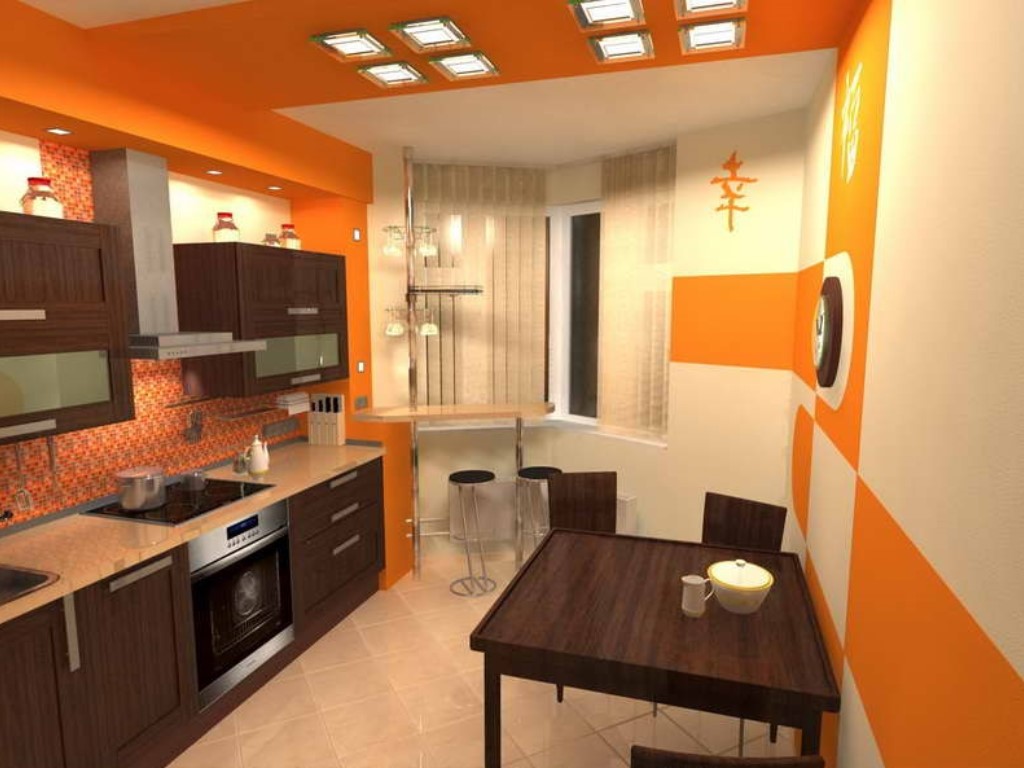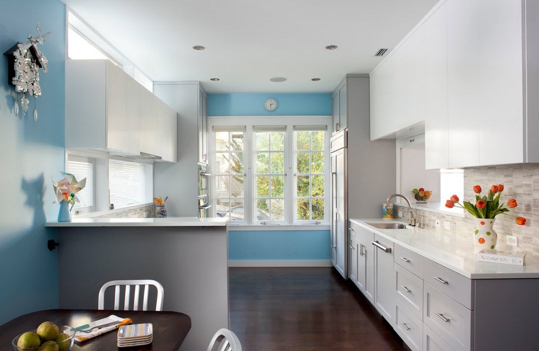 The color of the kitchen walls is of great importance in determining the style of the whole room. The correct color can visually expand the area and raise the ceiling. It is not recommended to use too bright colors when painting. The color of the walls is the main one and should be in harmony with the available kitchen furniture, but not coincide, because such a kitchen, when merging, will look boring. To obtain a saturated surface color, it is necessary to paint it up to 3 times, applying a new layer after the previous one is completely dry.