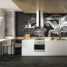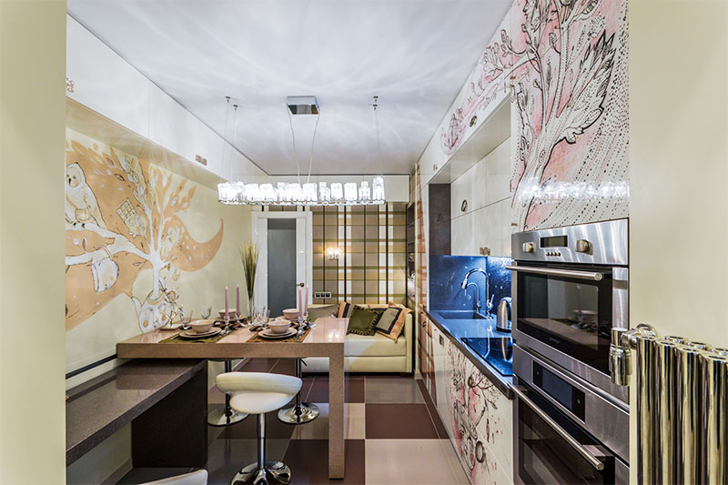 High-tech, or minimalist style is also inherent in the design solutions of kitchen interiors. High-tech is sometimes also called the “masculine” style for its strict interior (often in dark or even black tonality), the brilliance of many metal, glass and chrome parts. Minimalism tends, as the name implies, to brevity. At the same time, every detail is distinguished by high functionality, which makes minimalist interiors similar to Japanese dwellings. The presence of artistic painting, of course, will soften the severity of such kitchen interiors.