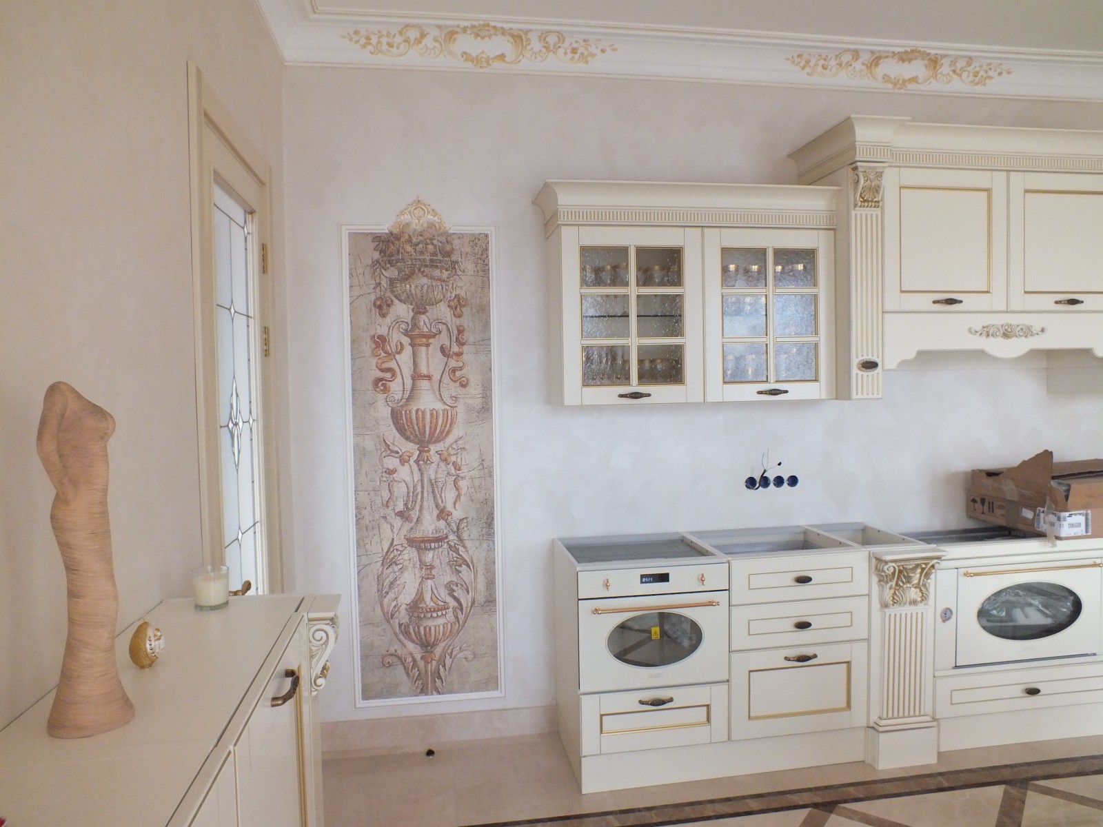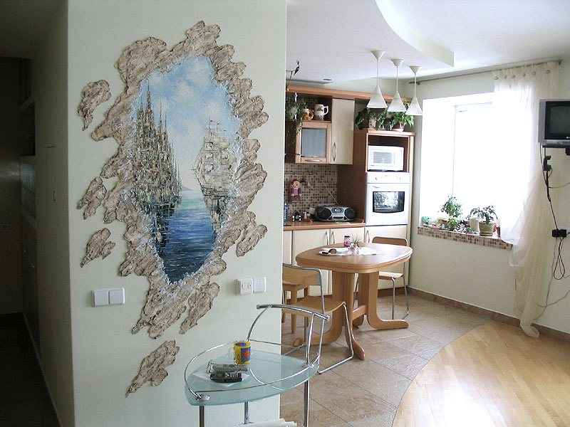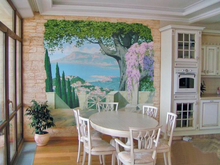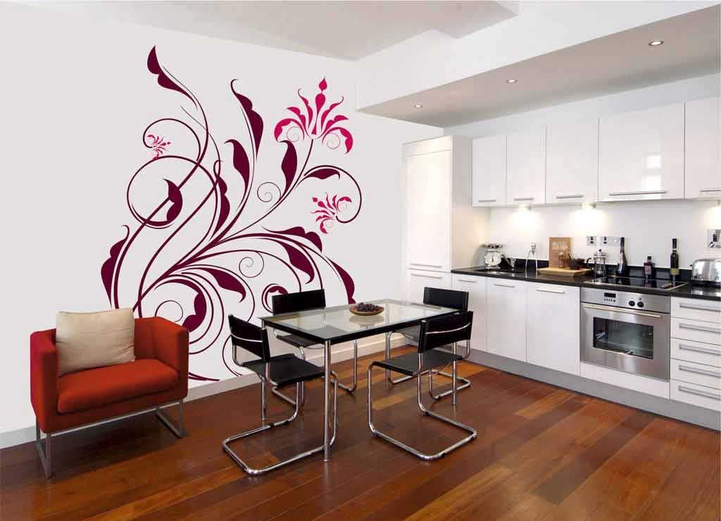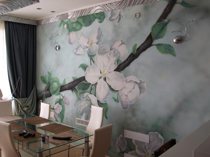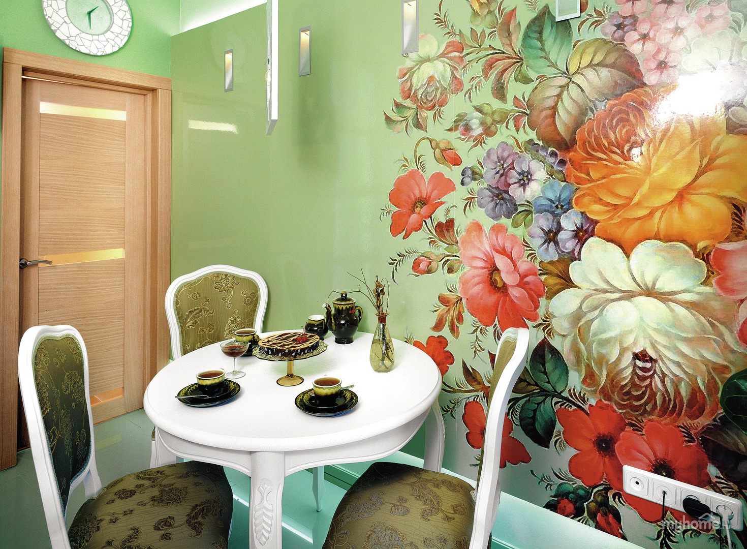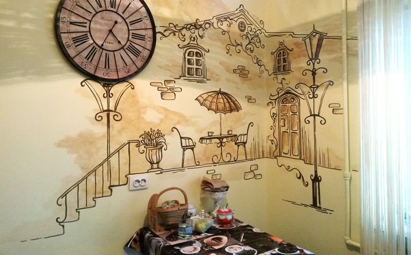 To begin with, the wall drawing in the kitchen is a serious matter. In the kitchen, especially the one combined with the dining room, you spend a lot of time - both for preparing meals, and for socializing with family and friends. Therefore, the preparatory work - the choice of drawing and technique of execution, the priming of the wall for painting - will require no less of your attention than the choice of wallpaper or paint for other residential premises.