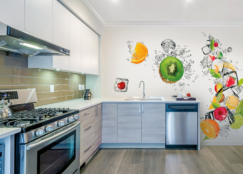 In contrast to the abstract design, it is good to use images of fruits, berries, flowers, kitchen utensils and antique dishes for the design of kitchen space. You can differently post and detail the paintings. Natural themes were and are still in demand: stylized trees, fruits, flowers, or butterflies. Additionally, they can decorate any piece of kitchen interior.