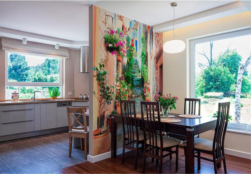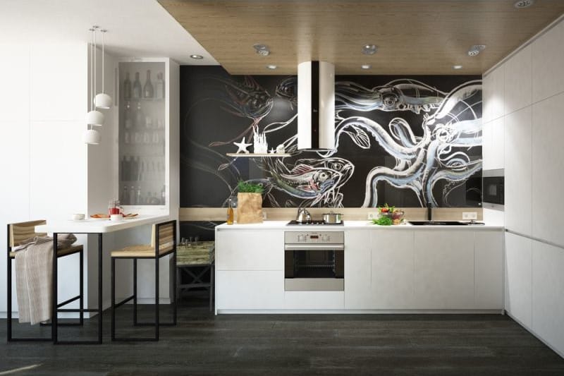 And it is possible to divide the kitchen wall into separate zones by using a wall pattern that is spacious, as in most modern houses, and make it more intimate. In addition, the wall painting helps to hide some of the shortcomings of the kitchen layout or, on the contrary, to emphasize the advantages of the design solution.