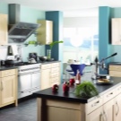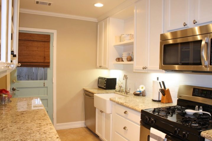 Another painting option is the color of the kitchen with waterproof paint that has anti-bacterial properties. By its quality characteristics, it is similar to the previous type of paint, but has the property of repelling harmful microbes. Thanks to this coating, the walls of your kitchen will be less contaminated. In addition, this paint does not contain harmful compounds, and its main feature is the fight against microorganisms, due to the fact that it consists of silver oxide. Typically, this paint has a very bright white color that does not turn yellow with time.