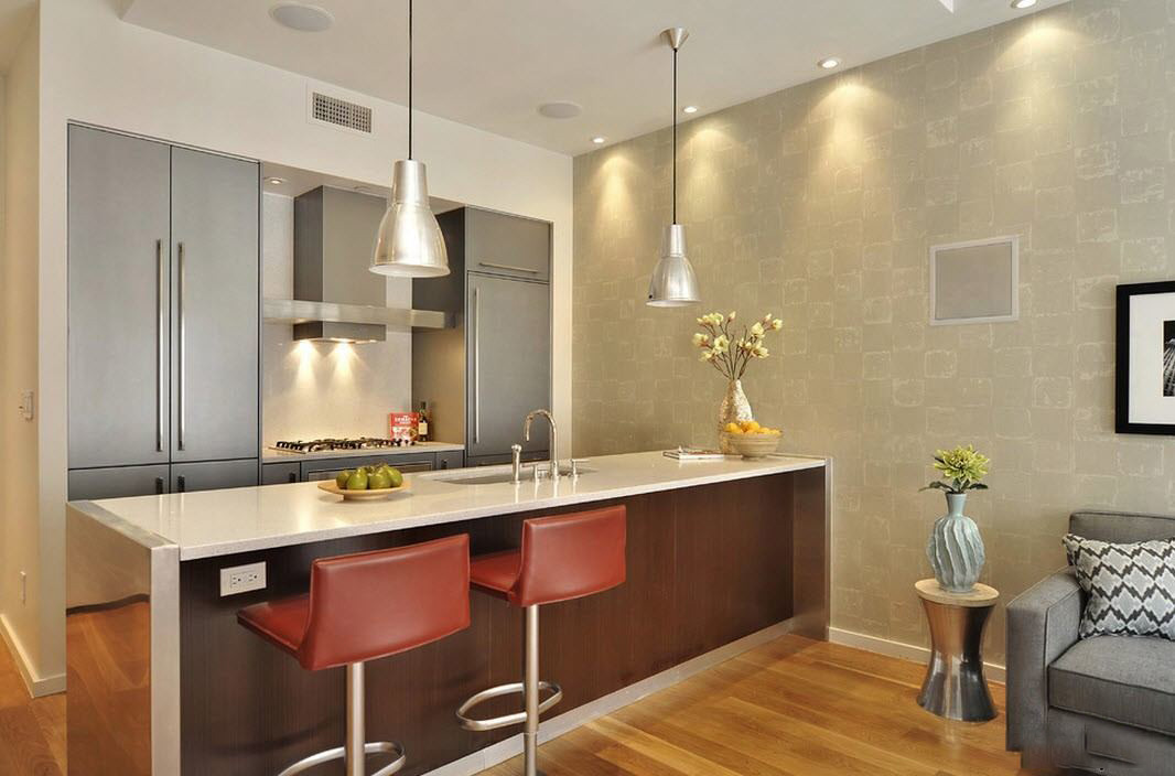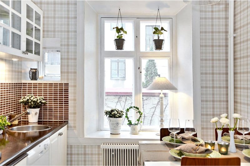 Now there are a huge number of different types of wallpapers that are perfect for gluing in the kitchen. It can be high-quality washable wallpaper that you can clean and wash without worrying about their safety. For the kitchen the most suitable option would be to purchase moisture-proof wallpaper. They, although they have a higher price than the usual types of wallpaper, but are very reliable. Regular moisture-resistant wallpaper for painting have two layers, which are impregnated with a special water-repellent substance.