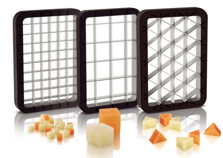 This element is used for cutting cubes of vegetables and fruits. It consists of a knife in the form of a lattice, which cuts the ingredients in a vertical plane. In the horizontal area, this function is performed by the knife, which rotates.The cubes are even and equal in size. They are able to decorate any salad, as well as form an original dish for the holiday table.