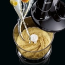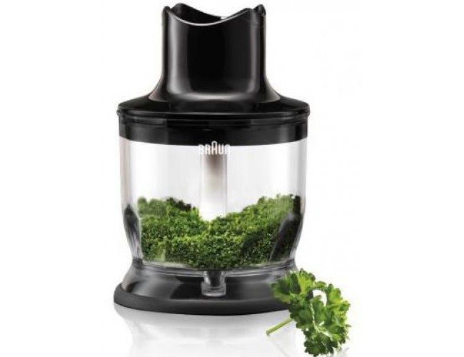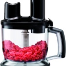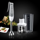 It has similar parameters for power, speed and switching. It is comfortable to work with one hand. A supplement to the previous model is a multifunctional splitting ice cup, 1.25 l in volume, and a small 350 ml chopper bowl. The motor runs quietly.