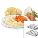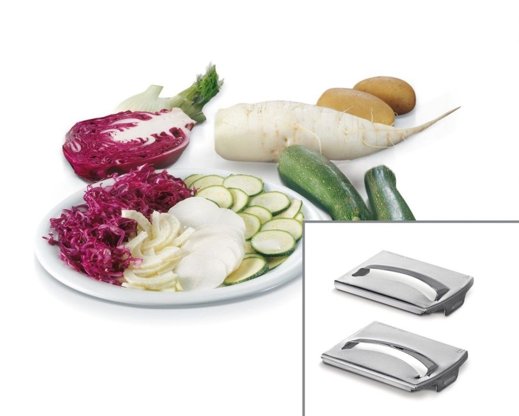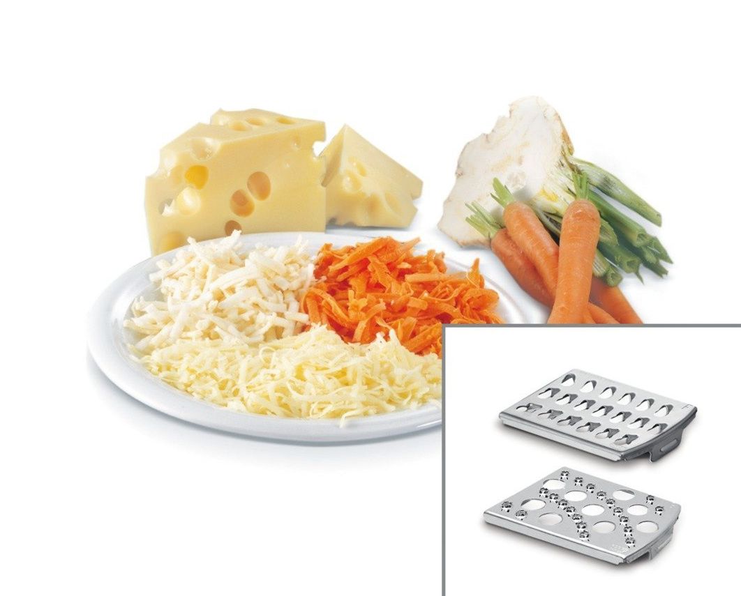 The kit additionally includes a 1.5 liter universal bowl that works as a combine. Includes double knife chopping, solid grater, cabbage chopper, slicing.