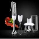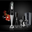The power of the product is 700 watts, operates at five speeds, which are continuously adjustable. It has three interchangeable nozzles that hide in the stand. With their help, you can chop, mix a cocktail, make mashed potatoes. The design is very beautiful, minimal details, ergonomic handle. The buttons are rubberized, which makes it possible to work even with wet hands.