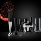 Power shredder 800 watts, adjustable speed options and turbo mode. The body and nozzle of the submersible blender are metallic. It is completed with such nozzles as a whisk, a grinder, nozzles for cutting into slices, a measuring glass with a lid, a small grinder for coffee, sugar, nuts, cheese and other solid products.