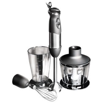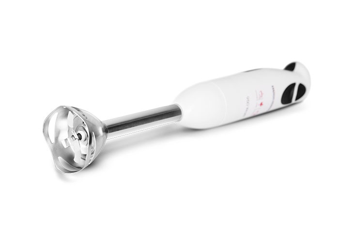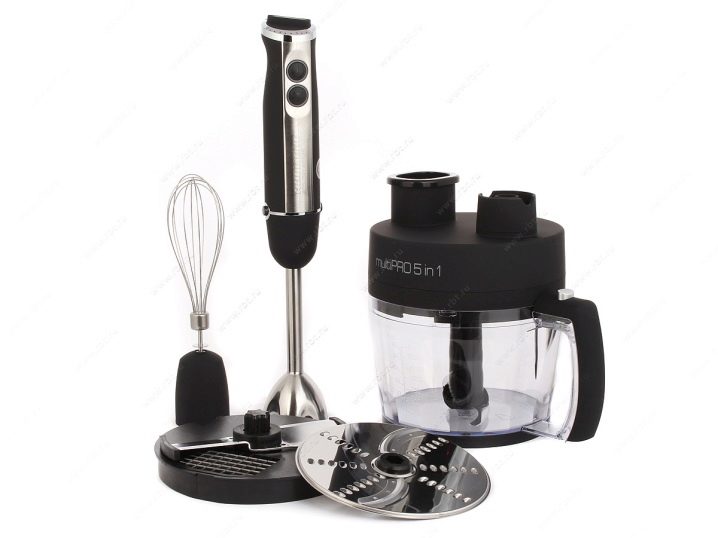 This model is the most inexpensive among blenders. It is offered in a minimum configuration, which includes a blender with a leg and two disc nozzles: for mixing and for beating. The declared power of the device is 950 W, but according to user feedback, in practice, no more than 300 W. The body itself is made of plastic, the leg is made of metal.